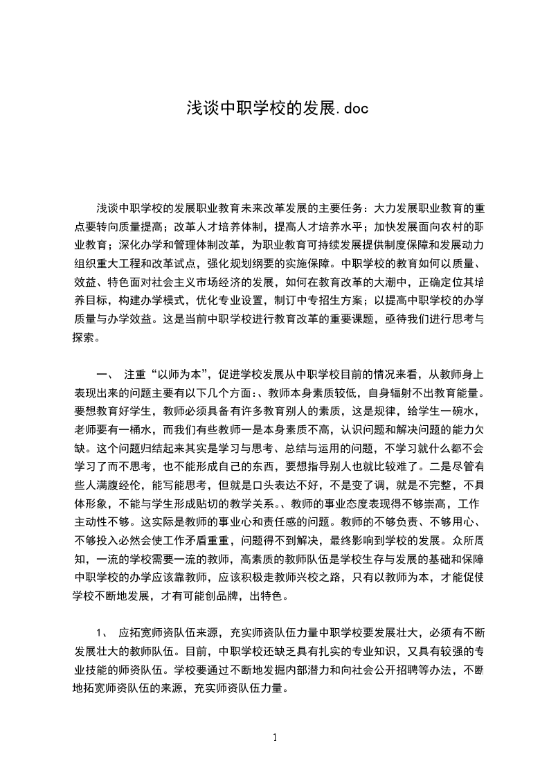 浅谈中职学校的发展职业教育未来改革发展的主要任务:大力发展职业教育的重点要转向质量提高;改革人才培养体制,提高人才培养水平;加快发展面向农村的职业教育;深化办学和管理体制改革,为职业教育可持续发展提供制度保障和发展动力;组织重大工程和改革试点,强化规划纲要的实施保障。中职学校的教育如何以质量、效益、特色面对社会主义市场经济的发展,如何在教育改革的大潮中,正确定位其培养目标,构建办学模式,优化专业设置,制订中专招生方案;以提高中职学校的办学质量与办学效益。这是当前中职学校进行教育改革的重要课题,亟待我们进行思考与探索。