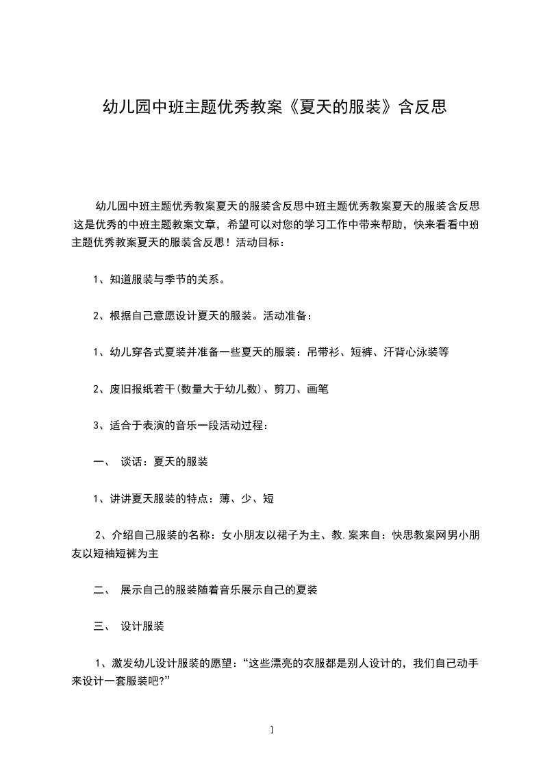 幼儿园中班主题优秀教案夏天的服装含反思中班主题优秀教案夏天的服装含反思这是优秀的中班主题教案文章,希望可以对您的学习工作中带来帮助,快来看看中班主题优秀教案夏天的服装含反思!活动目标: