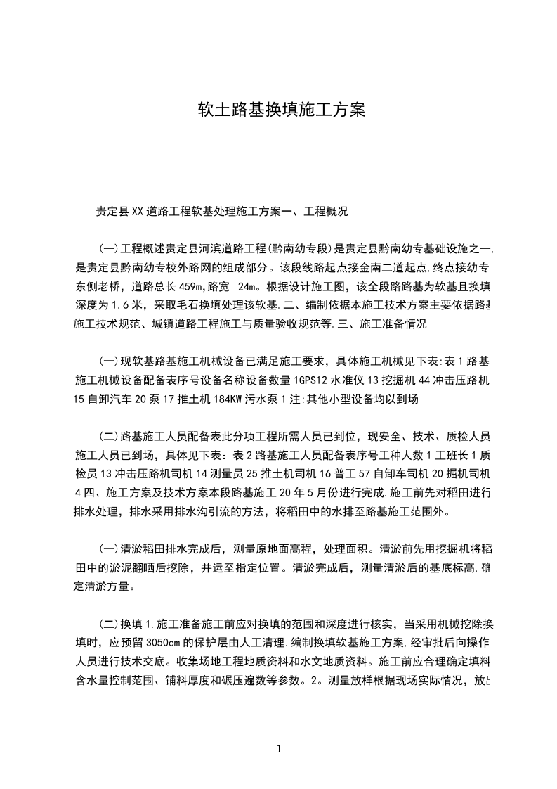 (一)工程概述贵定县河滨道路工程(黔南幼专段)是贵定县黔南幼专基础设施之一,是贵定县黔南幼专校外路网的组成部分。该段线路起点接金南二道起点,终点接幼专东侧老桥,道路总长459m,路宽24m。根据设计施工图,该全段路路基为软基且换填深度为1.6米,采取毛石换填处理该软基.二、编制依据本施工技术方案主要依据路基施工技术规范、城镇道路工程施工与质量验收规范等.三、施工准备情况