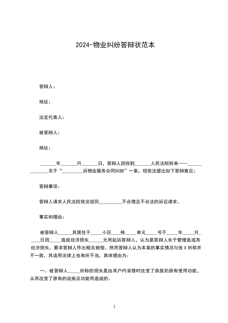 _______年_______月_______日,答辩人因收到_______人民法院转来——______________关于“_________诉物业服务合同纠纷”一案,现依法提出如下答辩意见: