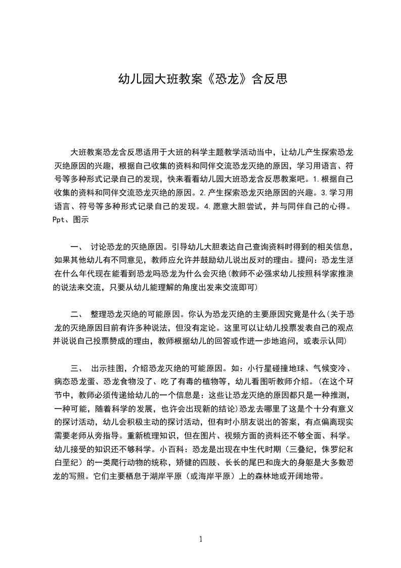 大班教案恐龙含反思适用于大班的科学主题教学活动当中,让幼儿产生探索恐龙灭绝原因的兴趣,根据自己收集的资料和同伴交流恐龙灭绝的原因,学习用语言、符号等多种形式记录自己的发现,快来看看幼儿园大班恐龙含反思教案吧。1.根据自己收集的资料和同伴交流恐龙灭绝的原因。2.产生探索恐龙灭绝原因的兴趣。3.学习用语言、符号等多种形式记录自己的发现。4.愿意大胆尝试,并与同伴自己的心得。Ppt、图示