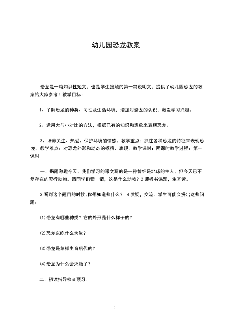 一、 讨论恐龙的灭绝原因。引导幼儿大胆表达自己查询资料时得到的相关信息,如果其他幼儿有不同意见,教师应允许并鼓励幼儿说出反对的理由。提问:恐龙生活在什么年代现在能看到恐龙吗恐龙为什么会灭绝(教师不必强求幼儿按照科学家推测的说法来交流,只要从幼儿能理解的角度出发来交流即可)