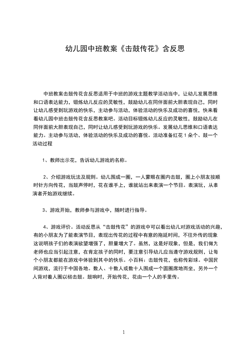 4、游戏评价。活动反思从“击鼓传花”的游戏中可以看出幼儿对游戏活动的兴趣,有的小朋友为了能表演节目,表现出传花的过程中有意的拖延时间,不往外传的现象。这说明孩子们的表演欲望增强了,胆量增大了。虽然,这是好现象,但是,我们做为老师也应当引起注意,在肯定孩子的同时,要注意引导幼儿应当遵守游戏规则,让每个小朋友都能在游戏中体验到其中的快乐。小百科:击鼓传花,也称传彩球。中国民间游戏,流行于中国各地。数人、十数人或数十人围成一个圆圈席地而坐,另外一个人背对着人圈以槌击鼓。鼓响时,开始传花,花由一个人的手里传。