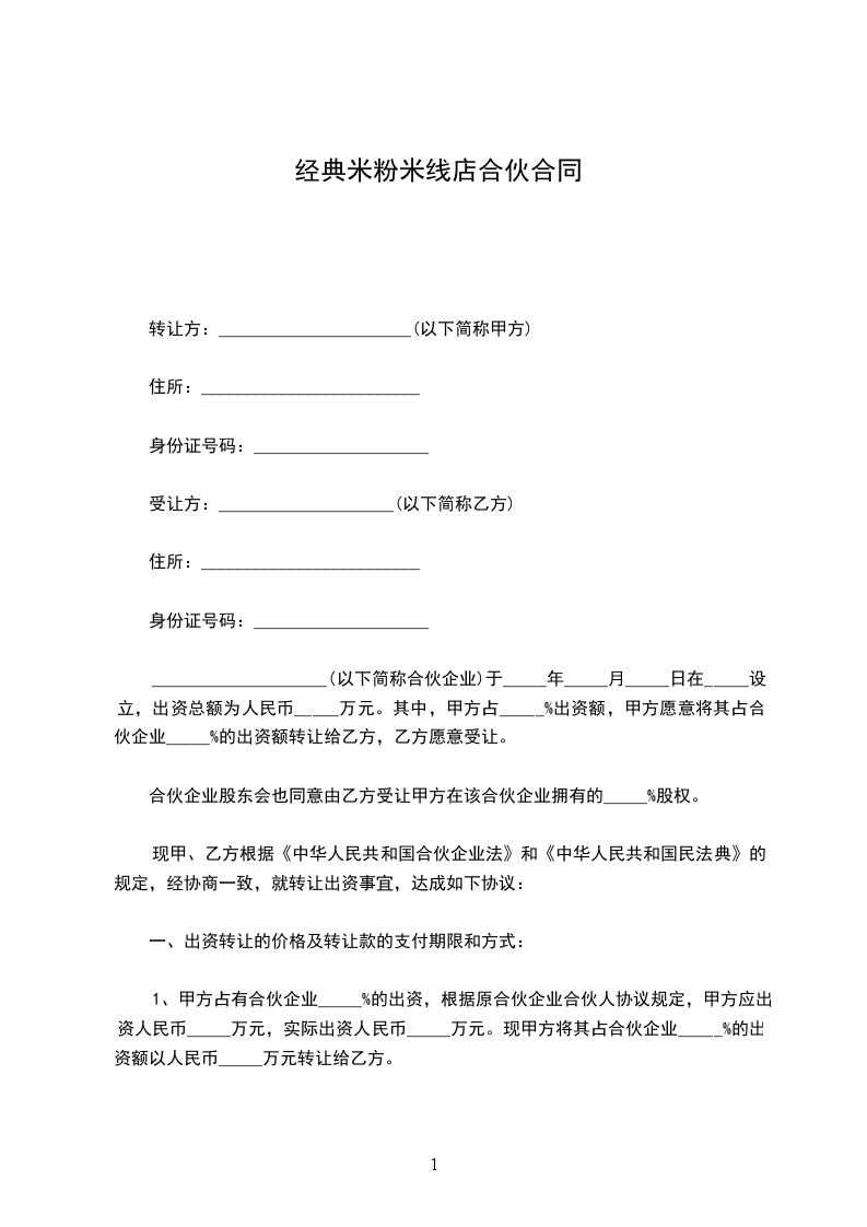 1、甲方占有合伙企业_____%的出资,根据原合伙企业合伙人协议规定,甲方应出资人民币_____万元,实际出资人民币_____万元。现甲方将其占合伙企业_____%的出资额以人民币_____万元转让给乙方。