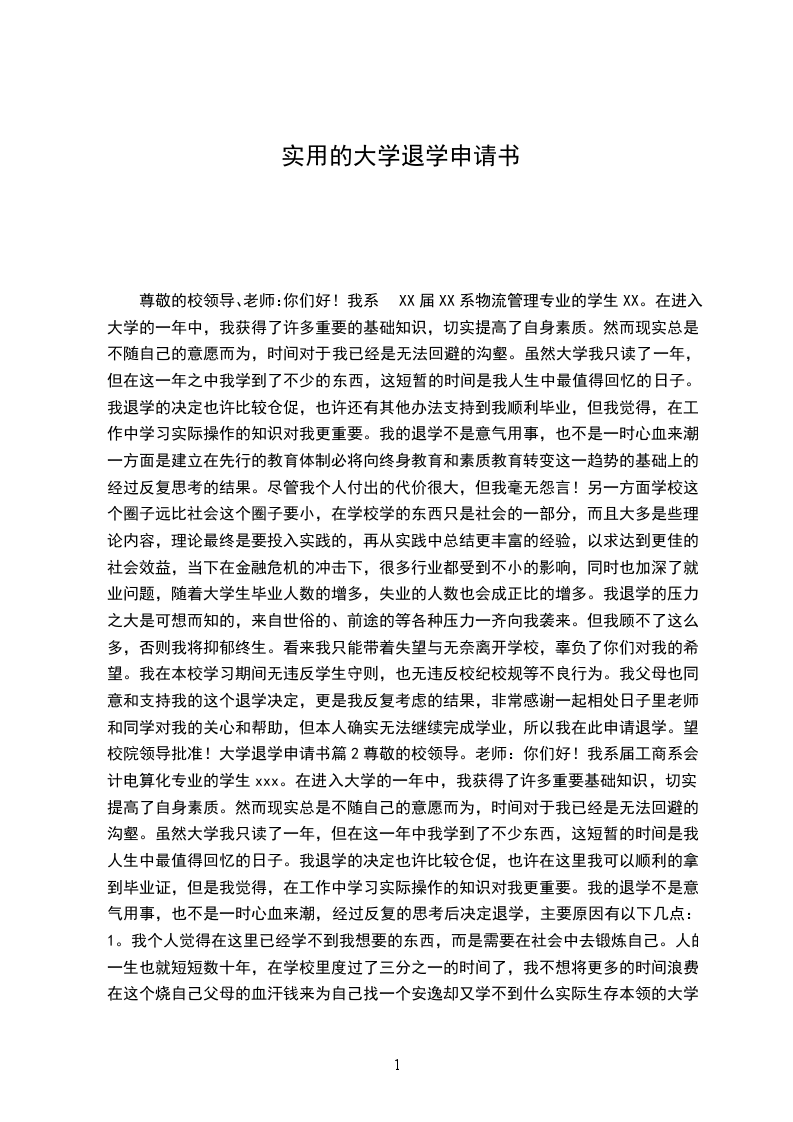 尊敬的校领导、老师:你们好!我系XX届XX系物流管理专业的学生XX。在进入大学的一年中,我获得了许多重要的基础知识,切实提高了自身素质。然而现实总是不随自己的意愿而为,时间对于我已经是无法回避的沟壑。虽然大学我只读了一年,但在这一年之中我学到了不少的东西,这短暂的时间是我人生中最值得回忆的日子。我退学的决定也许比较仓促,也许还有其他办法支持到我顺利毕业,但我觉得,在工作中学习实际操作的知识对我更重要。我的退学不是意气用事,也不是一时心血来潮,一方面是建立在先行的教育体制必将向终身教育和素质教育转变这一趋势的基础上的、经过反复思考的结果。尽管我个人付出的代价很大,但我毫无怨言!另一方面学校这个圈子远比社会这个圈子要小,在学校学的东西只是社会的一部分,而且大多是些理论内容,理论最终是要投入实践的,再从实践中总结更丰富的经验,以求达到更佳的社会效益,当下在金融危机的冲击下,很多行业都受到不小的影响,同时也加深了就业问题,随着大学生毕业人数的增多,失业的人数也会成正比的增多。我退学的压力之大是可想而知的,来自世俗的、前途的等各种压力一齐向我袭来。但我顾不了这么多,否则我将抑郁终生。看来我只能带着失望与无奈离开学校,辜负了你们对我的希望。我在本校学习期间无违反学生守则,也无违反校纪校规等不良行为。我父母也同意和支持我的这个退学决定,更是我反复考虑的结果,非常感谢一起相处日子里老师和同学对我的关心和帮助,但本人确实无法继续完成学业,所以我在此申请退学。望校院领导批准!大学退学申请书篇2尊敬的校领导。老师:你们好!我系届工商系会计电算化专业的学生xxx。在进入大学的一年中,我获得了许多重要基础知识,切实提高了自身素质。然而现实总是不随自己的意愿而为,时间对于我已经是无法回避的沟壑。虽然大学我只读了一年,但在这一年中我学到了不少东西,这短暂的时间是我人生中最值得回忆的日子。我退学的决定也许比较仓促,也许在这里我可以顺利的拿到毕业证,但是我觉得,在工作中学习实际操作的知识对我更重要。我的退学不是意气用事,也不是一时心血来潮,经过反复的思考后决定退学,主要原因有以下几点:1。我个人觉得在这里已经学不到我想要的东西,而是需要在社会中去锻炼自己。人的一生也就短短数十年,在学校里度过了三分之一的时间了,我不想将更多的时间浪费在这个烧自己父母的血汗钱来为自己找一个安逸却又学不到什么实际生存本领的大学了。2。在学校学的最终还是要在社会中去用,而且我觉得只有进入社会才会更好的学到一些生存本领,强着生存,这个自然法则永远不会变,好的生活是靠自己去创造的。