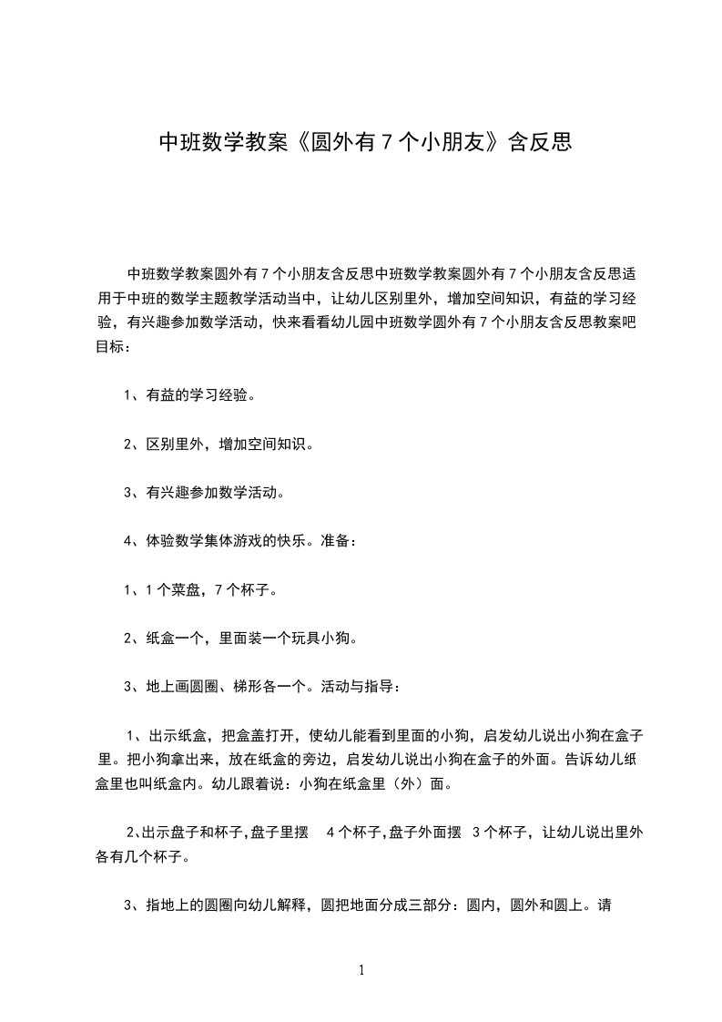 中班数学教案圆外有7个小朋友含反思中班数学教案圆外有7个小朋友含反思适用于中班的数学主题教学活动当中,让幼儿区别里外,增加空间知识,有益的学习经验,有兴趣参加数学活动,快来看看幼儿园中班数学圆外有7个小朋友含反思教案吧。目标: