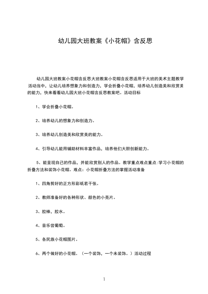 5、能呈现自己的作品,并能欣赏别人的作品。教学重点难点重点:学习小花帽的折叠方法和装饰小花帽。难点:小花帽折叠方法的掌握活动准备