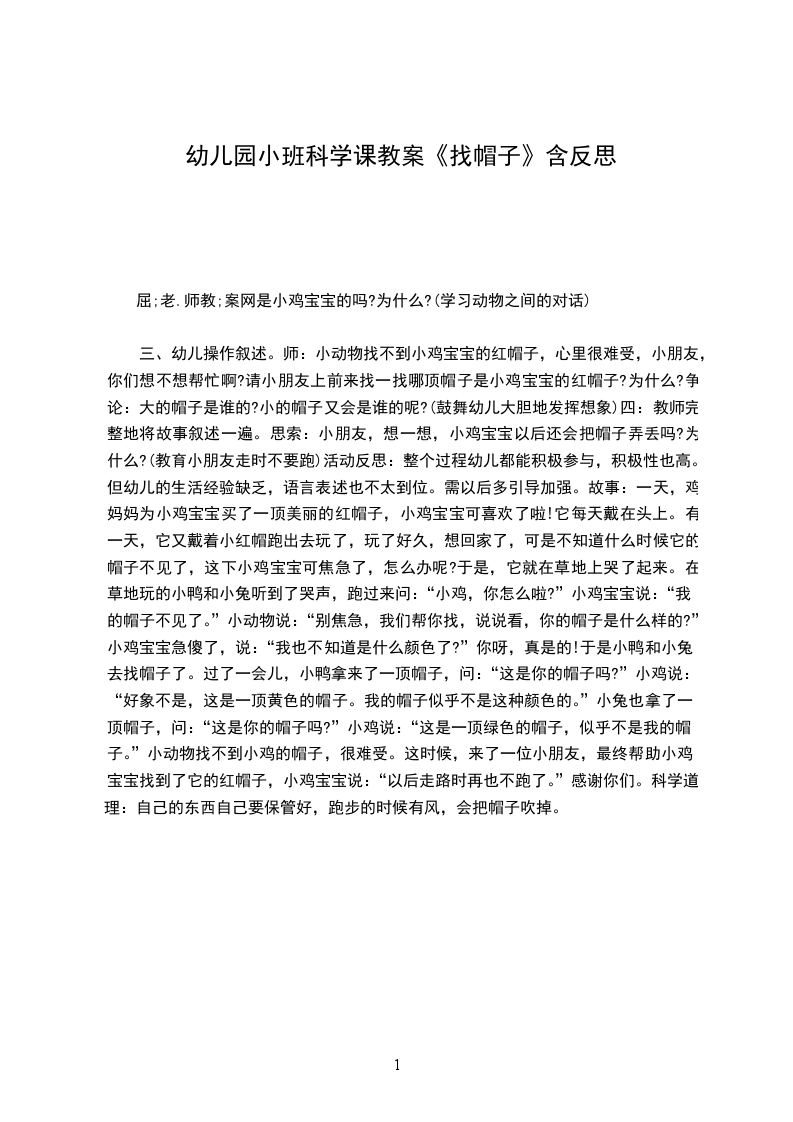 三、 结束环节:请幼儿和老师一起戴着自己做得小花帽跳尝葡萄舞蹈结束。延伸部分:把幼儿自己做得小花帽放在区角活动区,让幼儿随时玩区角游戏。教学反思此次教学活动中,在教幼儿小花帽的折叠方法时,做得不够好。出现了幼儿学不会的问题。下次应该选择更好的授课方法,吸引幼儿注意力。在活动过程中继续保持有耐心和有爱心的心态。小百科:帽子,一种戴在头部的服饰,多数可以覆盖头的整个顶部。帽子主要用于保护头部,部分帽子会有突出的边缘,可以遮盖阳光。帽子有遮阳、装饰、增温和防护等作用,因此种类也很多,选择也有很多讲究。