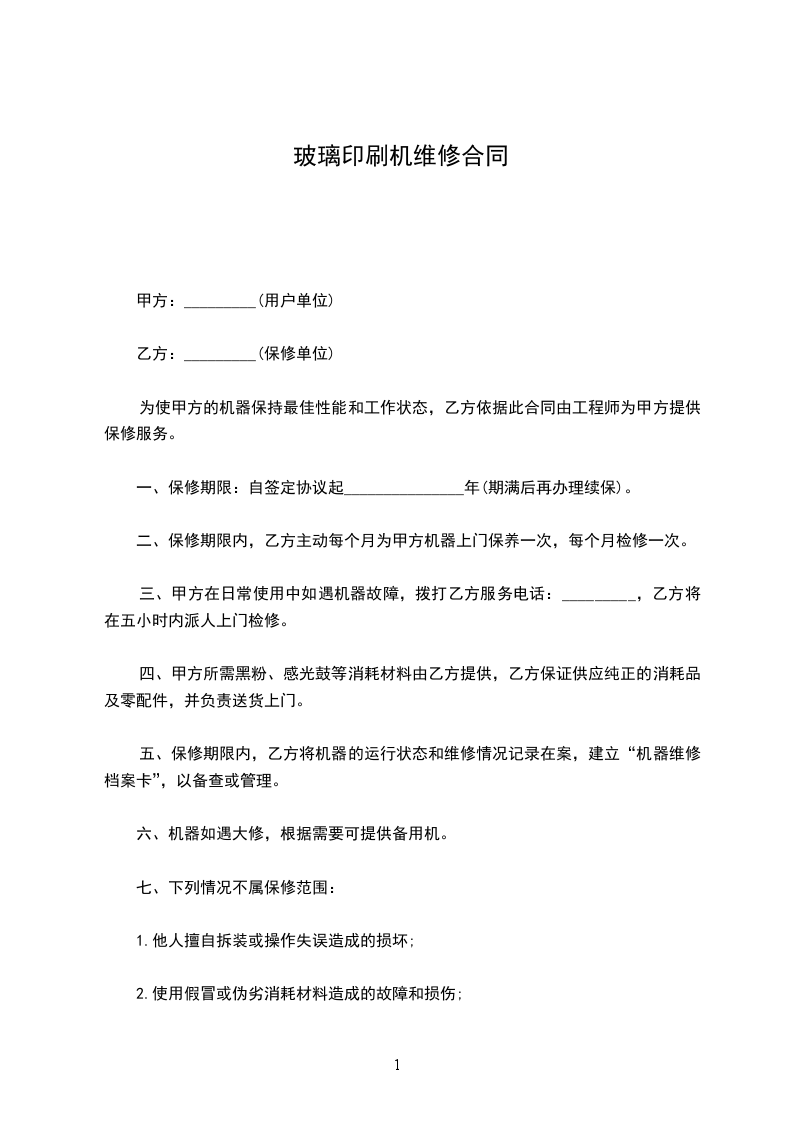 玻璃印刷机维修合同