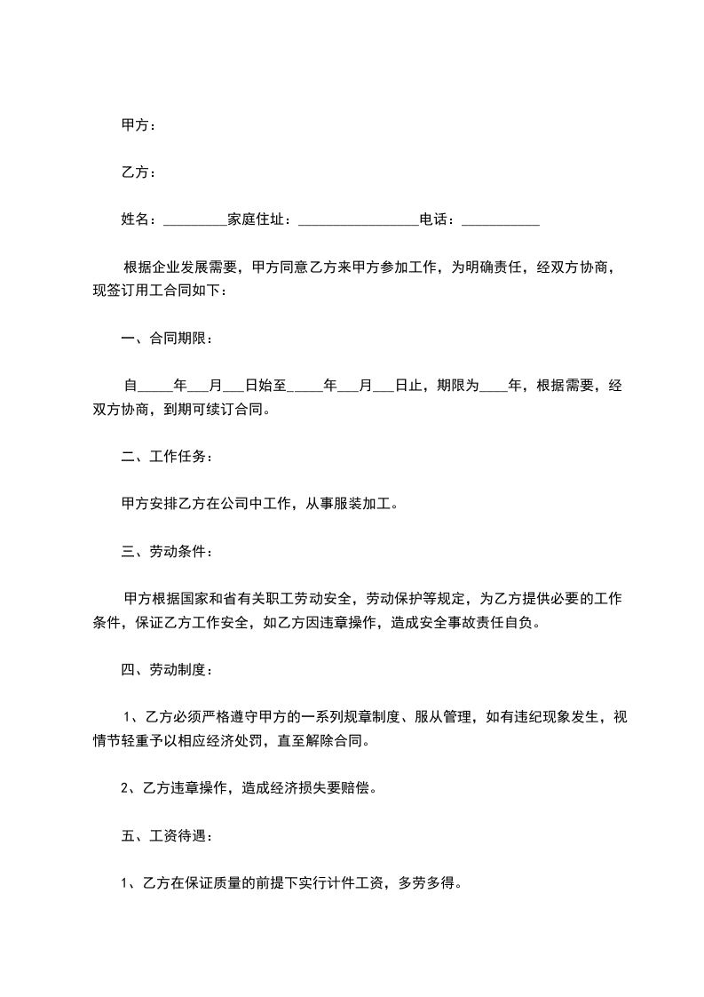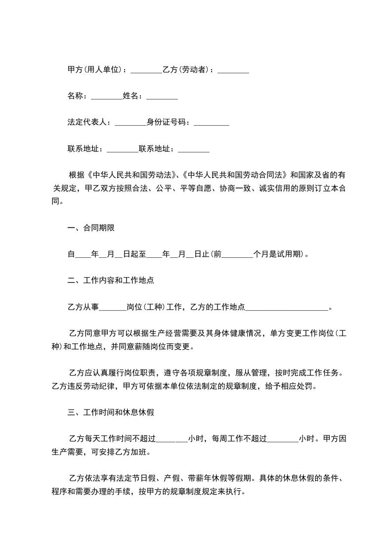 第二条 甲方根据工作需要,安排乙方在________工作岗位,乙方的工作任务为________,工作地点为________。经双方协商同意,甲方可以调换乙方的工种或岗位及工作地点。