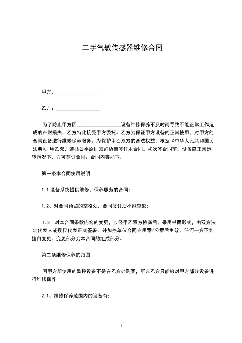为了防止甲方因__________________设备维修保养不及时而导致不能正常工作造成的产财损失,乙方特此接受甲方委托。乙方为保证甲方设备的正常使用,对甲方的合同设备进行维修保养服务。为保护甲乙双方的合法权益,根据《中华人民共和国民法典》,甲乙双方遵循公平原则友好协商签订本合同。初次签合同前,设备应正常运转情况下,方可签订合同。合同内容如下: