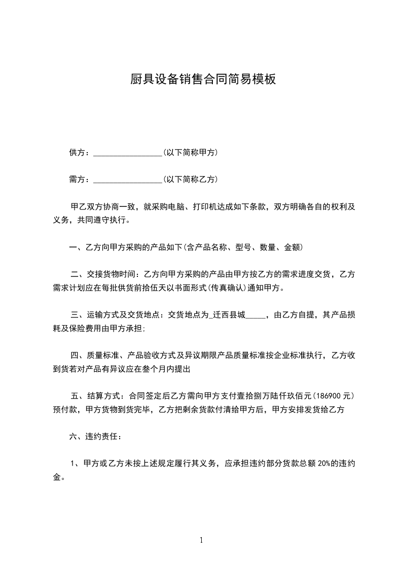 1、甲方或乙方未按上述规定履行其义务,应承担违约部分货款总额20%的违约金。