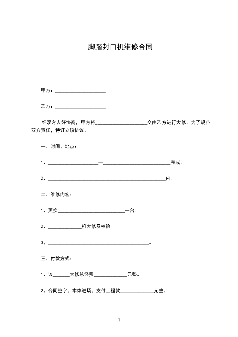 2、(1)协议签定起_______个工作日内,甲方向乙方支付保养维修费50%;