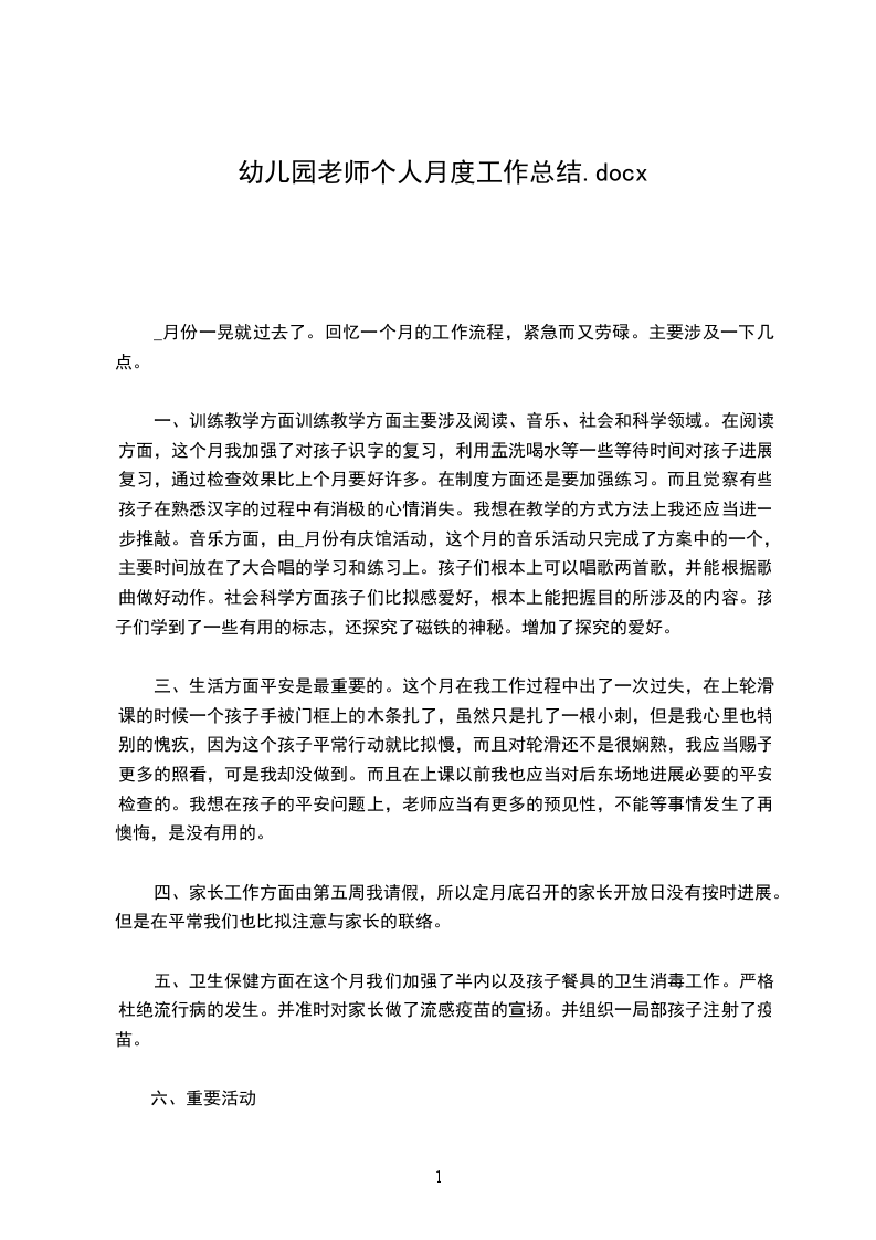 一、训练教学方面训练教学方面主要涉及阅读、音乐、社会和科学领域。在阅读方面,这个月我加强了对孩子识字的复习,利用盂洗喝水等一些等待时间对孩子进展复习,通过检查效果比上个月要好许多。在制度方面还是要加强练习。而且觉察有些孩子在熟悉汉字的过程中有消极的心情消失。我想在教学的方式方法上我还应当进一步推敲。音乐方面,由_月份有庆馆活动,这个月的音乐活动只完成了方案中的一个,主要时间放在了大合唱的学习和练习上。孩子们根本上可以唱歌两首歌,并能根据歌曲做好动作。社会科学方面孩子们比拟感爱好,根本上能把握目的所涉及的内容。孩子们学到了一些有用的标志,还探究了磁铁的神秘。增加了探究的爱好。