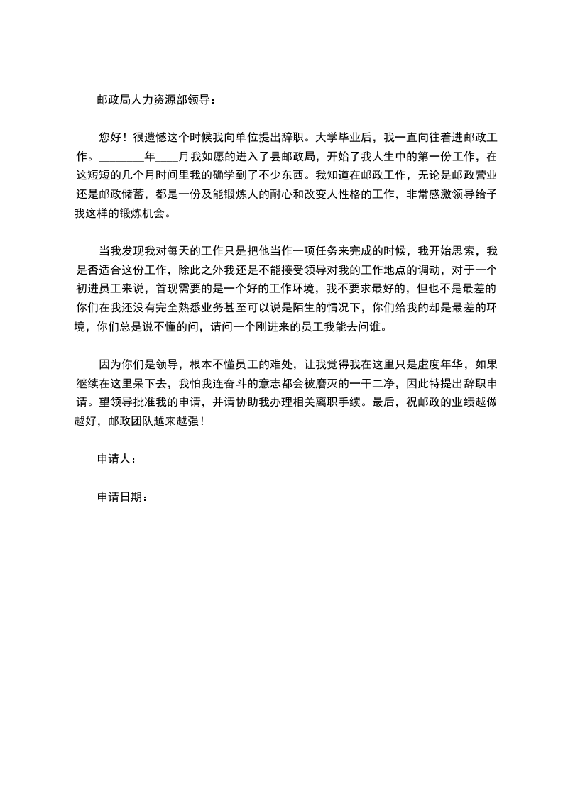 因为你们是领导,根本不懂员工的难处,让我觉得我在这里只是虚度年华,如果继续在这里呆下去,我怕我连奋斗的意志都会被磨灭的一干二净,因此特提出辞职申请。望领导批准我的申请,并请协助我办理相关离职手续。最后,祝邮政的业绩越做越好,邮政团队越来越强!