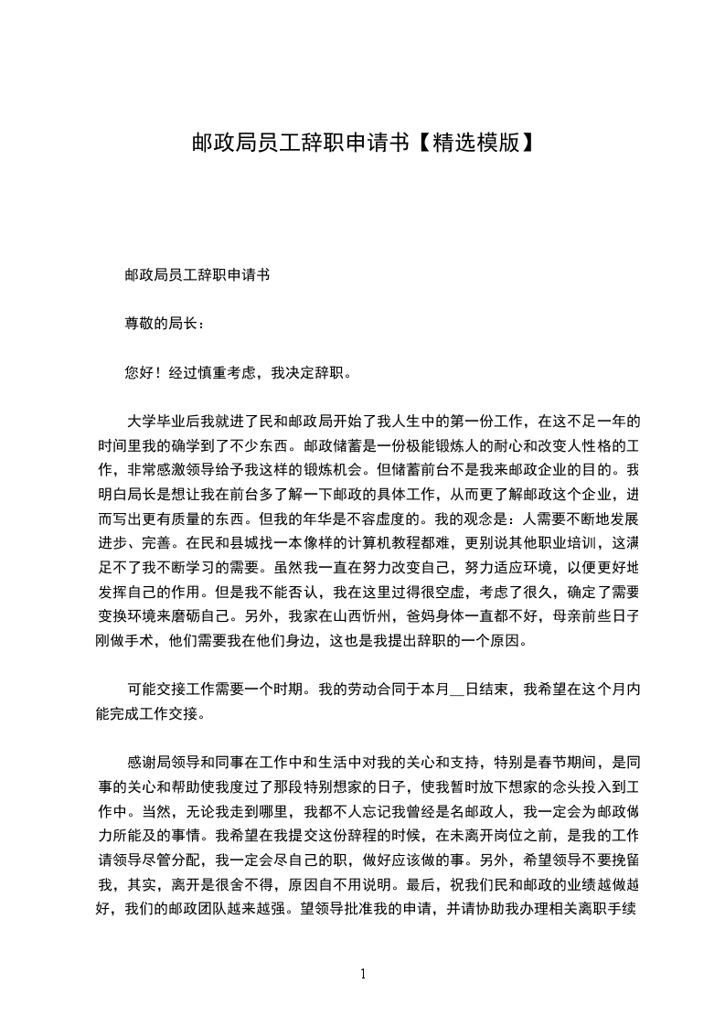 您好!很遗憾这个时候我向单位提出辞职。大学毕业后,我一直向往着进邮政工作。________年____月我如愿的进入了县邮政局,开始了我人生中的第一份工作,在这短短的几个月时间里我的确学到了不少东西。我知道在邮政工作,无论是邮政营业还是邮政储蓄,都是一份及能锻炼人的耐心和改变人性格的工作,非常感激领导给予我这样的锻炼机会。