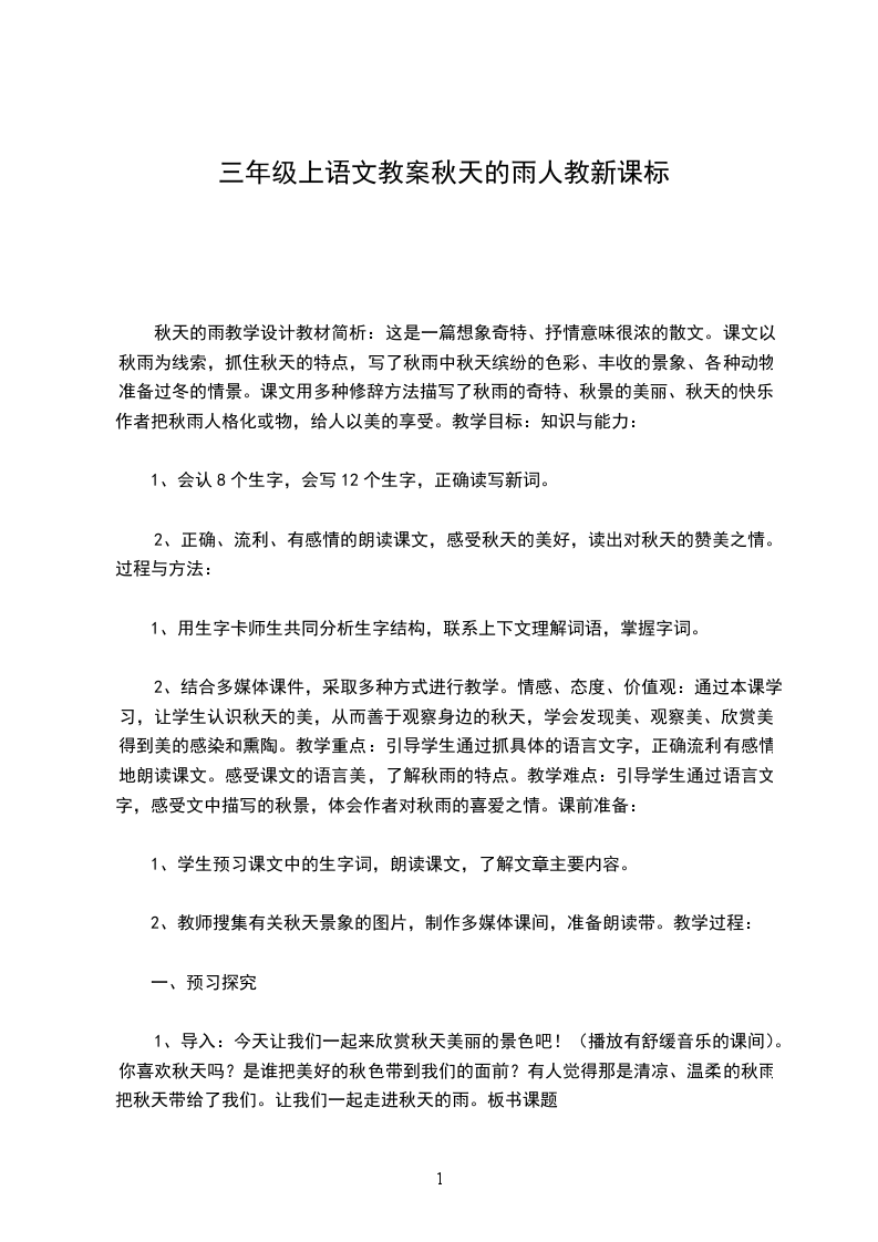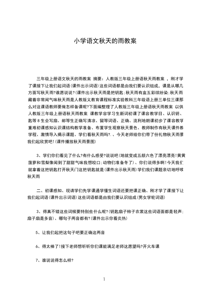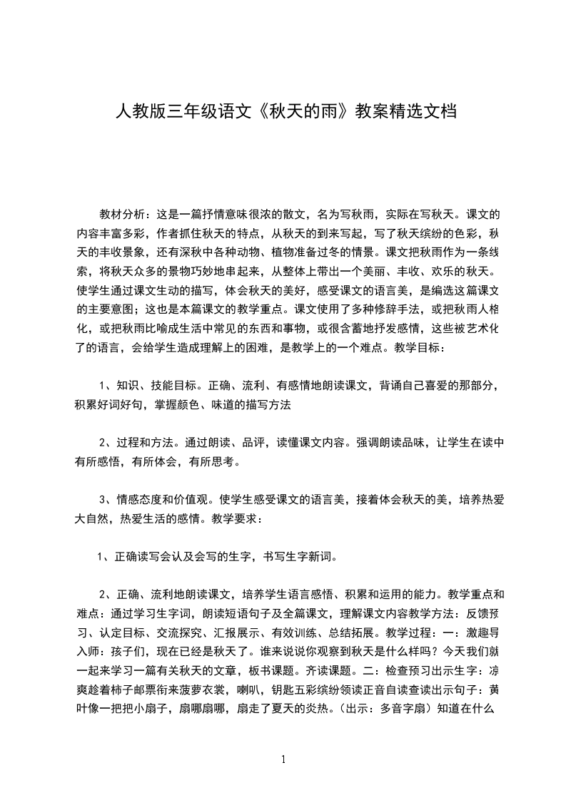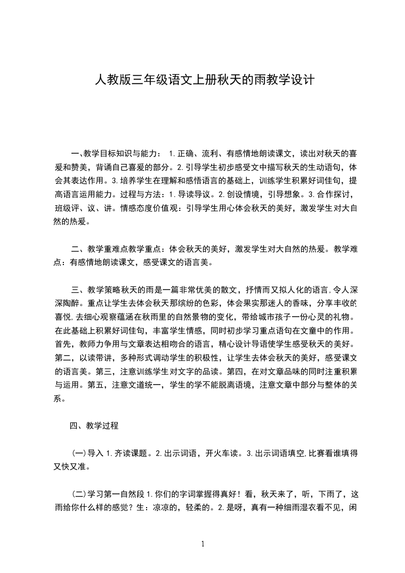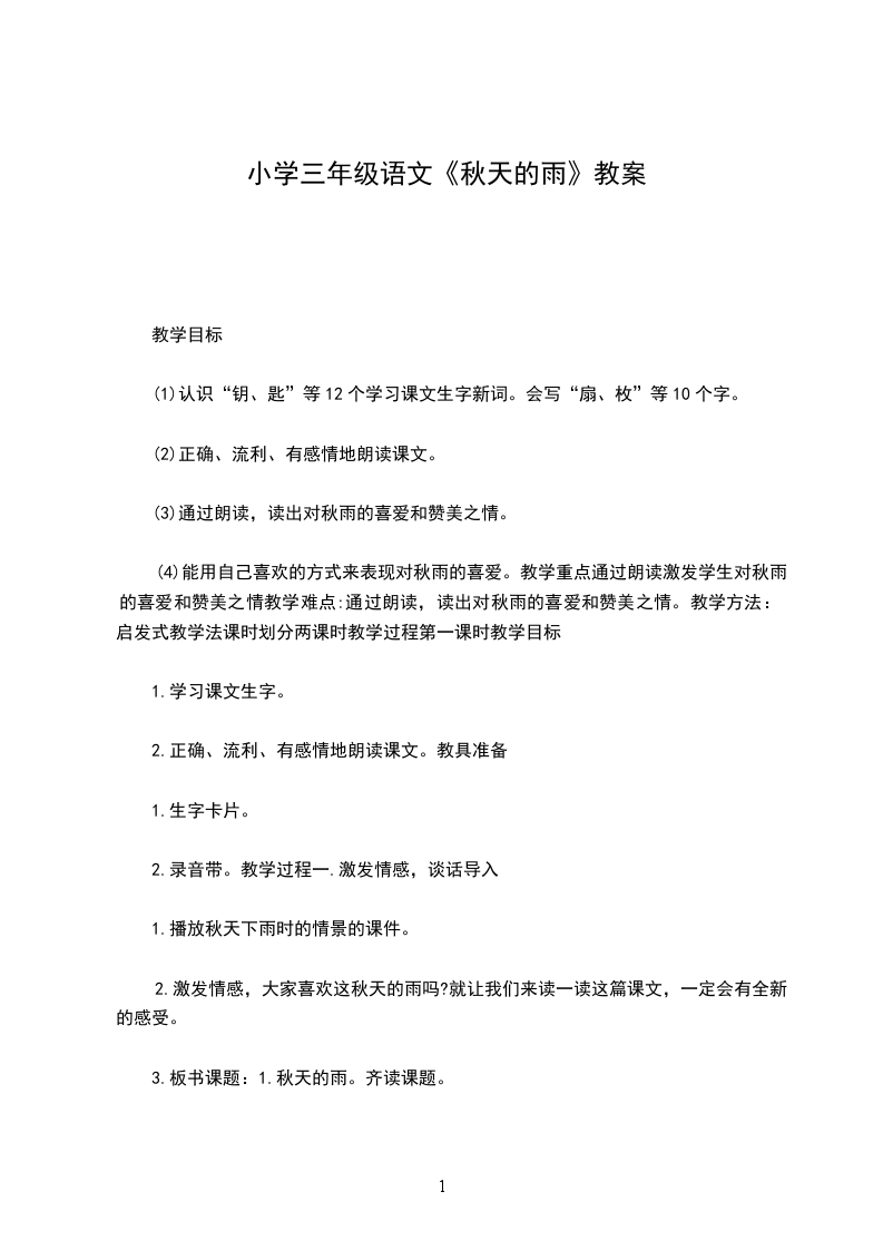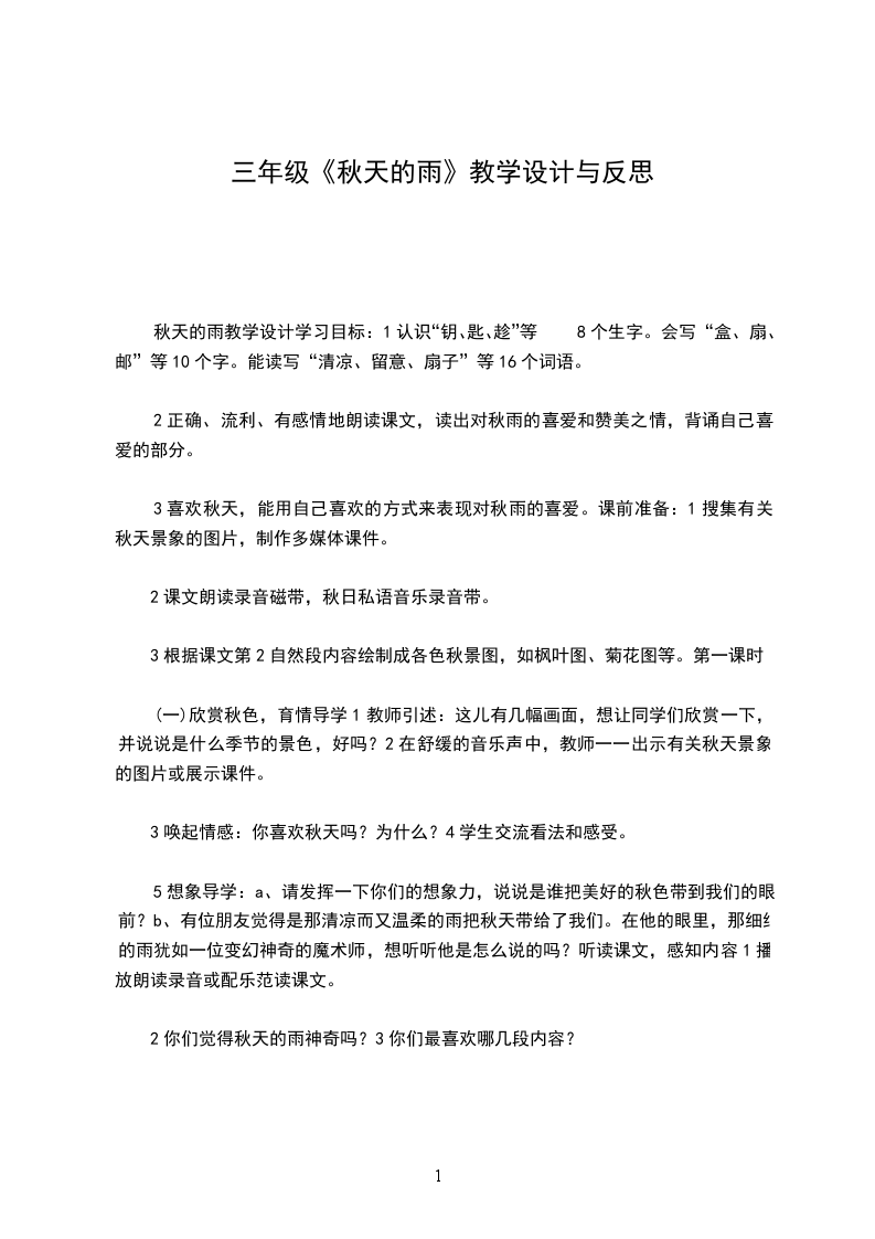 10、师:在你们的帮助下,秋天变得更美了。你们想看看这些美景吗?老师带大家去看看?在出发之前我们选一个读的最好的同学给我们配音,其他小朋友一边看画面一边用心去欣赏。咱们班谁读书最好?(课件出示秋景图,播放背景音乐)三年级语文秋天的雨教案的反思教学中,一上课,我以一组图片导入学习新课,因为本课是描写秋天的,在导入设计上也应与课文基调符合。而且这些图片形象直观,给孩子入情入境做好了铺垫,可以使孩子了解秋天的特点。对于生字的处理先是自己读,同桌互相认读,再是教师出示生字卡片检查生字学习情况,最后是出示一段话巩固生字词的掌握情况。对于写字的指导,先让生观察最难写的字,然后生板演,师纠正范写。对于这篇课文,在设计之初设计了第一课时的教学,对于第一课时我只抓了字词的教学和课文的整体朗读,而忽视了课文的品读。现在小学语文教学的要求是向40分钟要质量,一篇课文要设计成一课时的教学,既要抓字词的教学,又要抓课文的品读。课文的品读可以设计成这样:“秋天的雨是一把钥匙,轻轻地把秋天的大门打开了。走进秋天,我们看到的是怎样的景色呢?请你一边欣赏画面一边听老师读给你听。”这一教学环节,借助老师的配乐美读,秋天图片的美丽色彩的呈现,给学生听觉、视觉上的刺激,充分调动学习的兴趣,对秋天有一个美的整体影响,引发美读文章的欲望。接着让学生自读课文,从几个方面感受秋天的美。在整体感知全文的基础上,走进秋天的大门,走进文章,抓住“五彩缤纷”感受秋天的色彩美;抓住“好闻的气味”想象秋天丰收的景象,通过“小动物准备过冬忙碌的景象”感受秋天的欢乐。在读懂文章内容的基础上,想象读、表演读、带着体验读,自由读、个人读、集体读,变抽象为具象,读出秋天的美。秋天的雨把黄色给了银杏树,银杏叶子的形状多么像小扇子,把黄黄的叶子比作(生说)一把把扇子,为我们扇走了夏天的炎热。请一个同学来读一读,可以边读边做动作通过朗读不仅使学生体会语言文字的韵律美,同时把语言文字化作鲜明的视觉再现学生的想象,激发学生情感中真、善、美的因素,并与作者、与文章产生共鸣,情感受到美的感召和升华,从中受到教育。并且在此句话中,还运用的比较的方法,去掉“扇啊扇啊”,“飘啊飘啊”,通过对比读感受语言的魅力。可以说,这节课,学生将生活带入课堂,在课堂上他们读着课文,谈着生活,丰富的生活经历帮助他们理解了这么优美的散文,使“晦涩”变成了“通俗”。但课堂确实是一门遗憾的艺术。安排计划只能是预设的,而课堂是多变的。本节课下来没能完成教学计划,让我遗憾。主要是在第一段一些环节上花的时间的太多。第二段安排欠妥,在某些环节放开了没能即时收回来。造成时间不够。这也说明自己教学不娴熟,课堂把握不够。