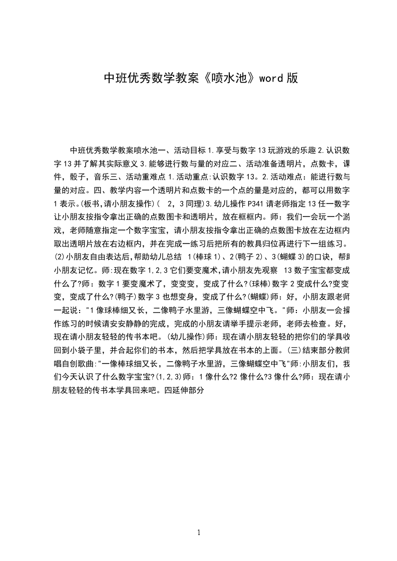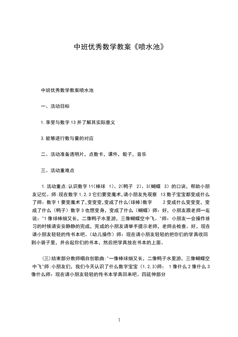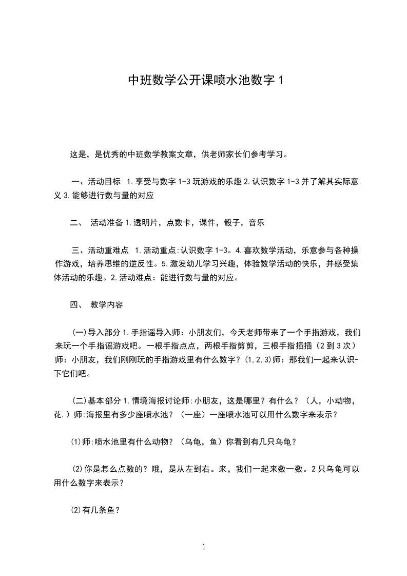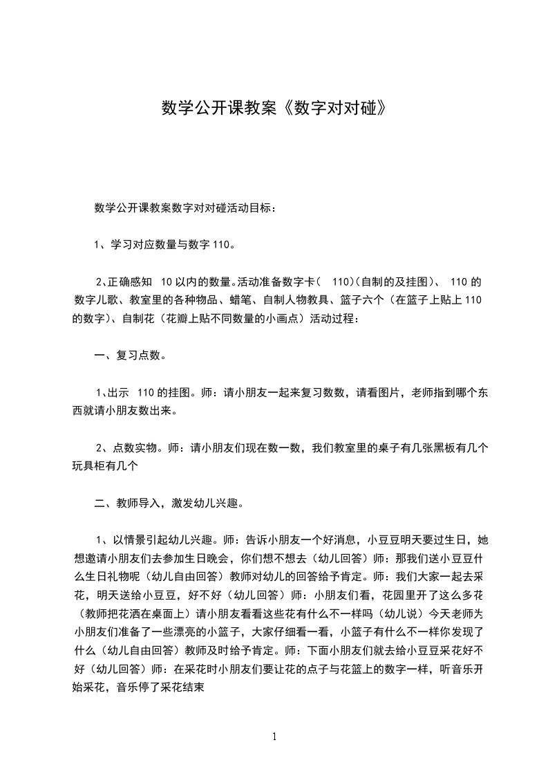 (3)小结:今天李老师带来了很多香喷喷水果,这里有几个苹果?(1个)数字1可以用来表示一个苹果,还可以表示一座喷水池,一个小狗。这里有几个西瓜?(2个)数字2可以表示2个西瓜,也可以表示2只乌龟,还可以表示2只小鸟。有几条香蕉?(3条)数字3可以表示3条香蕉,也可以表示3条小鱼。(引导幼儿)那数字2可以表示几个滑板车?数字3可以表示几辆自行车?师:小朋友出去玩的时候有什么感受?(开心)嗯,小朋友出去玩或户外活动的时候都很开心,还可以锻炼你们身体哦!2.师幼互动(出示教具:透明片、数字卡)1介绍教具名称:透明片,数字卡,师:老师还带了一份礼物,小朋友猜猜是什么?叮叮叮师:它有一个好听的名字叫透明片,这是数字卡。师:这里有几个透明片?(1个)可以用数字1来表示。这张点数卡里有几个点?(1个)也可以用数字1来表示。一个透明片和点数卡的一个点的量是对应的,都可以用数字1表示。(板书,请小朋友操作)(2,3同理)3.幼儿操作P341请老师指定13任一数字,让小朋友按指令拿出正确的点数图卡和透明片,放在框框内。师:我们一会玩一个游戏,老师随意指定一个数字宝宝,请小朋友按指令拿出正确的点数图卡放在左边框内,取出透明片放在右边框内,并在完成一练习后把所有的教具归位再进行下一组练习。