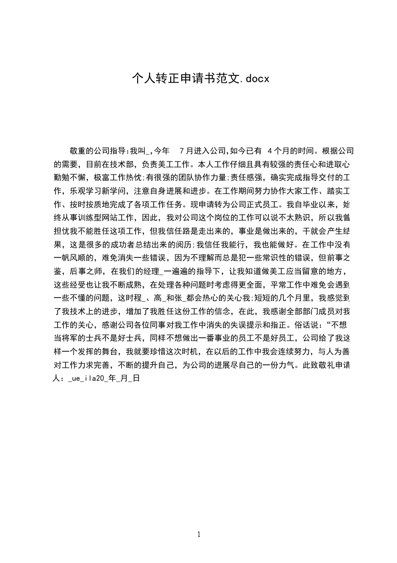敬重的公司指导:我叫_,今年7月进入公司,如今已有4个月的时间。根据公司的需要,目前在技术部,负责美工工作。本人工作仔细且具有较强的责任心和进取心,勤勉不懈,极富工作热忱;有很强的团队协作力量;责任感强,确实完成指导交付的工作,乐观学习新学问,注意自身进展和进步。在工作期间努力协作大家工作、踏实工作、按时按质地完成了各项工作任务。现申请转为公司正式员工。我自毕业以来,始终从事训练型网站工作,因此,我对公司这个岗位的工作可以说不太熟识,所以我曾担忧我不能胜任这项工作,但我信任路是走出来的,事业是做出来的,干就会产生结果,这是很多的成功者总结出来的阅历;我信任我能行,我也能做好。在工作中没有一帆风顺的,难免消失一些错误,因为不理解而总是犯一些常识性的错误,但前事之鉴,后事之师,在我们的经理_一遍遍的指导下,让我知道做美工应当留意的地方,这些经受也让我不断成熟,在处理各种问题时考虑得更全面,平常工作中难免会遇到一些不懂的问题,这时程_、高_和张_都会热心的关心我;短短的几个月里,我感觉到了我技术上的进步,增加了我胜任这份工作的信念,在此,我感谢全部部门成员对我工作的关心,感谢公司各位同事对我工作中消失的失误提示和指正。俗话说:“不想当将军的士兵不是好士兵,同样不想做出一番事业的员工不是好员工,公司给了我这样一个发挥的舞台,我就要珍惜这次时机,在以后的工作中我会连续努力,与人为善,对工作力求完善,不断的提升自己,为公司的进展尽自己的一份力气。此致敬礼申请人:_ue_ila20_年_月_日