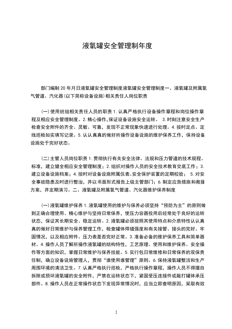 部门编制20年月日液氧罐安全管理制度液氧罐安全管理制度一、液氧罐及附属氧气管道、汽化器(以下简称设备设施)相关责任人岗位职责