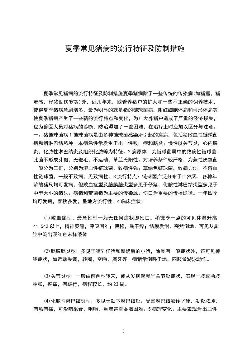 夏季常见猪病的流行特征及防制措施夏季猪病除了一些传统的传染病(如猪瘟,猪流感,仔猪副伤寒等)外,近几年来,随着养猪户的扩大和一些不正确的饲养技术,使得夏季猪病急剧增多,最为明显的就是猪的链球菌病,附红细胞体病和弓形体病等,使夏季猪病产生了一些新的流行特点和变化,为广大养猪户造成了严重的经济损失,也为兽医人员对猪病的诊断,防治添加了一些困难,在治疗上时应加以区分与注意。一、猪链球菌病1链球菌病是由多种链球菌感染所引起的疾病,包括猪败血性链球菌病和猪淋巴结脓肿。本病急性常发生于出血性败血症和脑炎;慢性以关节炎,心内膜炎,化脓性淋巴结炎及组织化脓等为特征。2病原体:为链球菌属中的致病性链球菌。此菌不形成芽孢,无鞭毛,不运动,革兰氏阳性。对培养条件较严格,为兼性厌氧菌。一般分为三群,分别为溶血性链球菌,致病性强;草绿色链球菌,致病力弱;不溶血性链球菌,一般不致病,无致病性。3流行特点:链球菌广泛分布于自然界,各种年龄的猪只均可发病,但败血症型及脑膜脑炎型多见于仔猪,化脓性淋巴结炎型多见于中型大小的猪只。病猪和带菌猪为主要的传染源。伤口为重要的传播途径。一年四季均可发病,春秋多发,呈地方流行性。4临床症状: