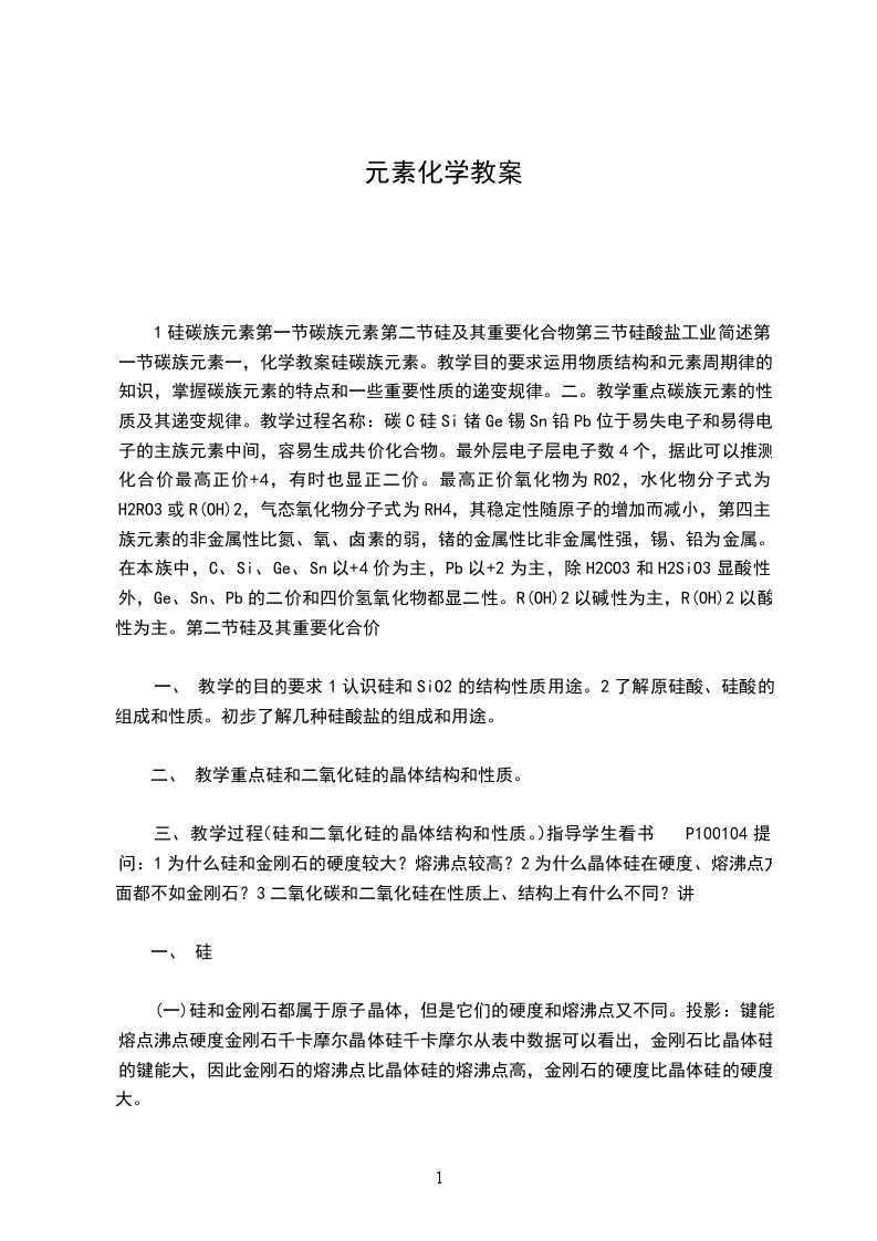 1硅碳族元素第一节碳族元素第二节硅及其重要化合物第三节硅酸盐工业简述第一节碳族元素一,化学教案硅碳族元素。教学目的要求运用物质结构和元素周期律的知识,掌握碳族元素的特点和一些重要性质的递变规律。二。教学重点碳族元素的性质及其递变规律。教学过程名称:碳C硅Si锗Ge锡Sn铅Pb位于易失电子和易得电子的主族元素中间,容易生成共价化合物。最外层电子层电子数4个,据此可以推测化合价最高正价+4,有时也显正二价。最高正价氧化物为RO2,水化物分子式为H2RO3或R(OH)2,气态氧化物分子式为RH4,其稳定性随原子的增加而减小,第四主族元素的非金属性比氮、氧、卤素的弱,锗的金属性比非金属性强,锡、铅为金属。在本族中,C、Si、Ge、Sn以+4价为主,Pb以+2为主,除H2CO3和H2SiO3显酸性外,Ge、Sn、Pb的二价和四价氢氧化物都显二性。R(OH)2以碱性为主,R(OH)2以酸性为主。第二节硅及其重要化合价