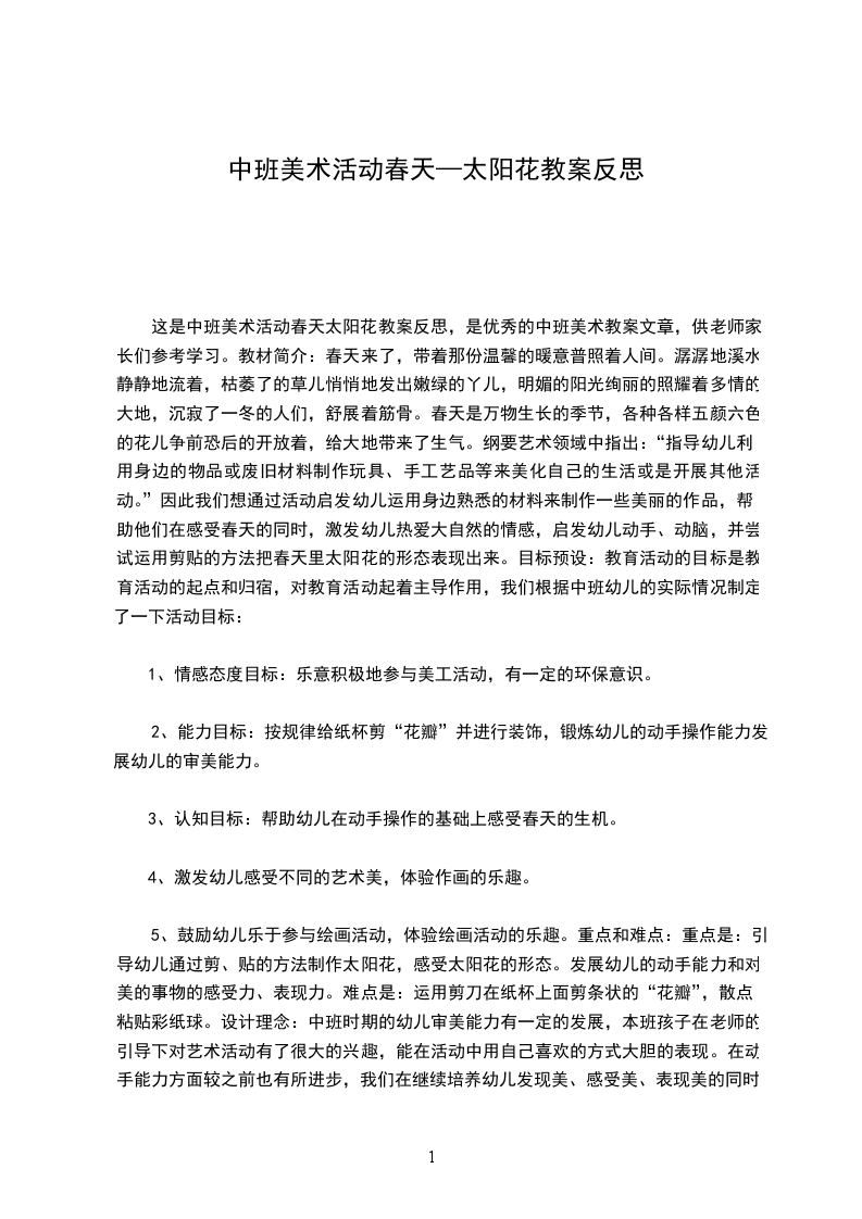 这是中班美术活动春天太阳花教案反思,是优秀的中班美术教案文章,供老师家长们参考学习。教材简介:春天来了,带着那份温馨的暖意普照着人间。潺潺地溪水静静地流着,枯萎了的草儿悄悄地发出嫩绿的丫儿,明媚的阳光绚丽的照耀着多情的大地,沉寂了一冬的人们,舒展着筋骨。春天是万物生长的季节,各种各样五颜六色的花儿争前恐后的开放着,给大地带来了生气。纲要艺术领域中指出:“指导幼儿利用身边的物品或废旧材料制作玩具、手工艺品等来美化自己的生活或是开展其他活动。”因此我们想通过活动启发幼儿运用身边熟悉的材料来制作一些美丽的作品,帮助他们在感受春天的同时,激发幼儿热爱大自然的情感,启发幼儿动手、动脑,并尝试运用剪贴的方法把春天里太阳花的形态表现出来。目标预设:教育活动的目标是教育活动的起点和归宿,对教育活动起着主导作用,我们根据中班幼儿的实际情况制定了一下活动目标:
