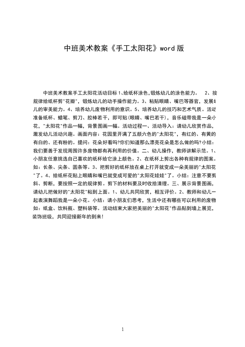 5、鼓励幼儿乐于参与绘画活动,体验绘画活动的乐趣。重点和难点:重点是:引导幼儿通过剪、贴的方法制作太阳花,感受太阳花的形态。发展幼儿的动手能力和对美的事物的感受力、表现力。难点是:运用剪刀在纸杯上面剪条状的“花瓣”,散点粘贴彩纸球。设计理念:中班时期的幼儿审美能力有一定的发展,本班孩子在老师的引导下对艺术活动有了很大的兴趣,能在活动中用自己喜欢的方式大胆的表现。在动手能力方面较之前也有所进步,我们在继续培养幼儿发现美、感受美、表现美的同时,也在进一步培养幼儿通过利用身边物品来创造的环保意识。设计思路:中班孩子年龄较小,动手能力差,完美的表现一件作品比较困难。为了能让中班的孩子在美术活动中体会到成功与快乐,一次,我发现纸杯可以做成各种漂亮的纸杯花,因样子很像太阳,我为它起名“太阳花”。它不但美观漂亮而且简单易学,非常适合中班孩子学习。因此,开展了这次别开生面的美工活动。活动目标