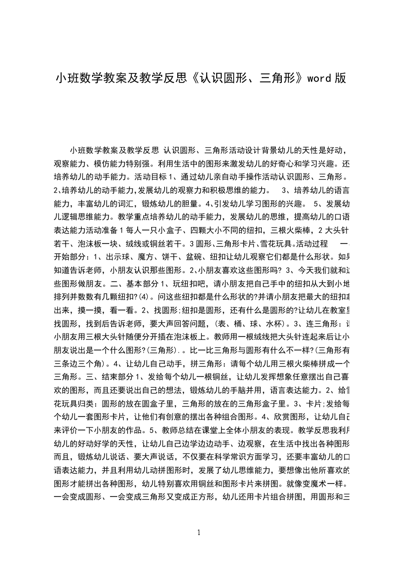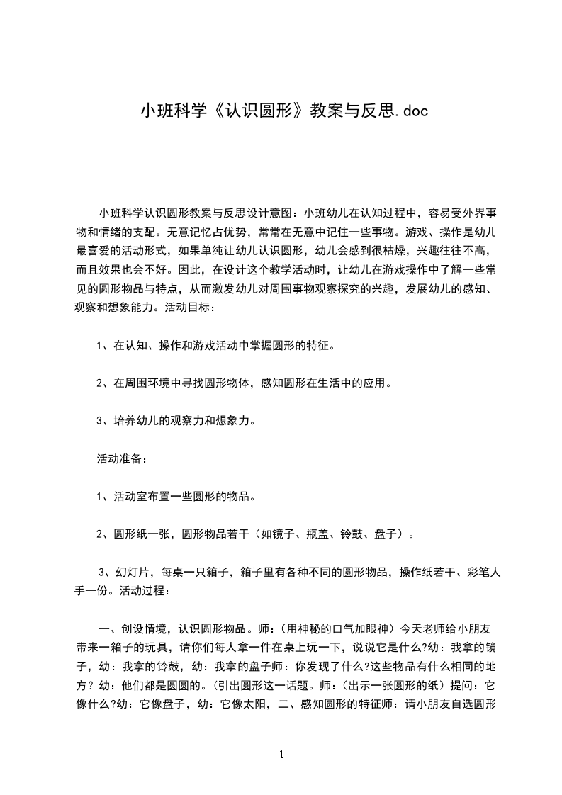 七、 游戏拉个圆圈走走1.师:今天圆形宝宝玩得真高兴,我们也来玩个拉个圆圈走走的游戏吧。2.游戏延伸:用创编的句式进行游戏。拉个圆圈走走,拉个圆圈走走,走走走走,变成一个大皮球。(变成一条毛毛虫、望远镜等等)。活动反思:本次活动我先出示圆圆国王的头,调动孩子兴趣,然后以国王的口吻教孩子学习儿歌。再出示儿歌的图谱,看上去简洁明了,听老师说完几遍后,有的孩子就能自己看图谱初步说出儿歌。最后用圆圆国王送礼物的形式,让孩子了解更多我们生活中圆形的物体。过程中,老师是挨个让幼儿去找蔬菜而不是一拥而上。