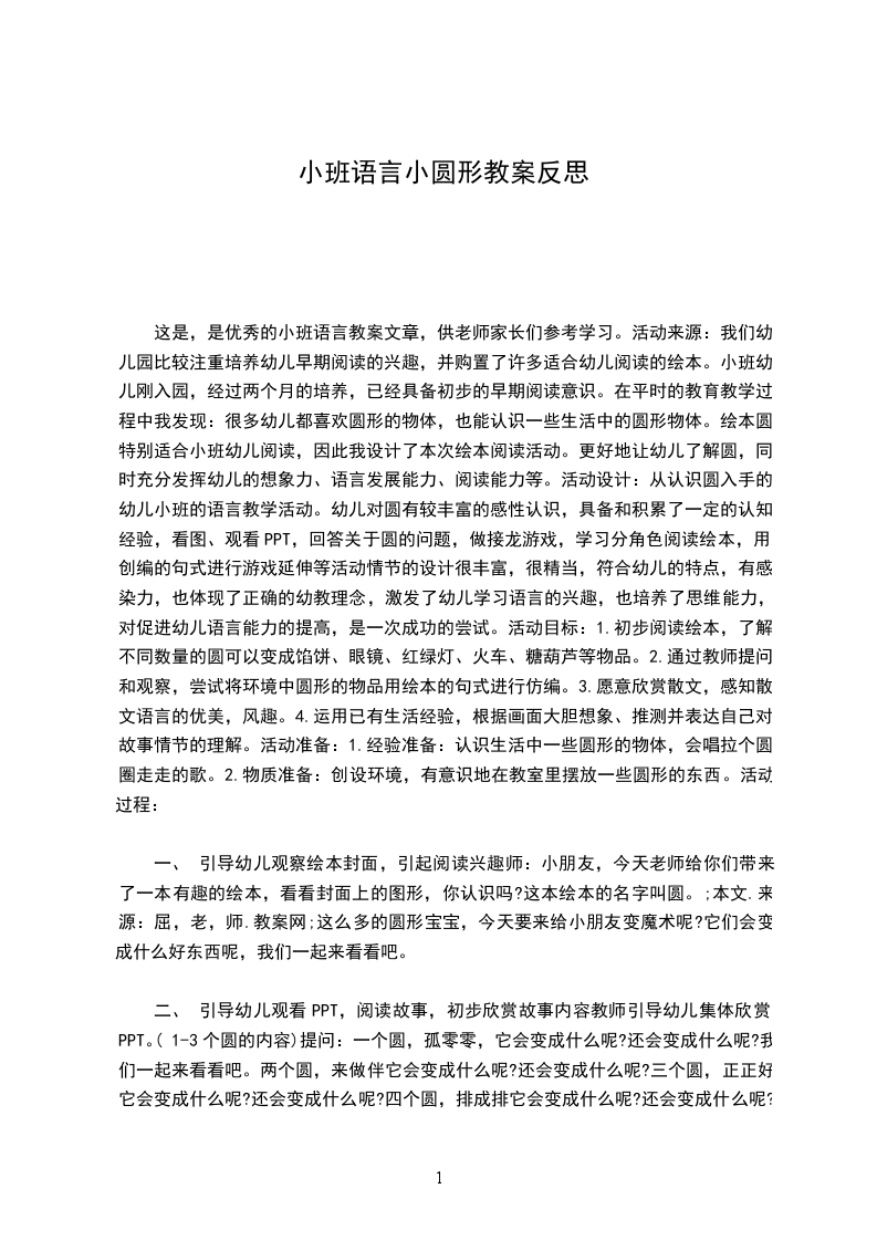 这是,是优秀的小班语言教案文章,供老师家长们参考学习。活动来源:我们幼儿园比较注重培养幼儿早期阅读的兴趣,并购置了许多适合幼儿阅读的绘本。小班幼儿刚入园,经过两个月的培养,已经具备初步的早期阅读意识。在平时的教育教学过程中我发现:很多幼儿都喜欢圆形的物体,也能认识一些生活中的圆形物体。绘本圆特别适合小班幼儿阅读,因此我设计了本次绘本阅读活动。更好地让幼儿了解圆,同时充分发挥幼儿的想象力、语言发展能力、阅读能力等。活动设计:从认识圆入手的幼儿小班的语言教学活动。幼儿对圆有较丰富的感性认识,具备和积累了一定的认知经验,看图、观看PPT,回答关于圆的问题,做接龙游戏,学习分角色阅读绘本,用创编的句式进行游戏延伸等活动情节的设计很丰富,很精当,符合幼儿的特点,有感染力,也体现了正确的幼教理念,激发了幼儿学习语言的兴趣,也培养了思维能力,对促进幼儿语言能力的提高,是一次成功的尝试。活动目标:1.初步阅读绘本,了解不同数量的圆可以变成馅饼、眼镜、红绿灯、火车、糖葫芦等物品。2.通过教师提问和观察,尝试将环境中圆形的物品用绘本的句式进行仿编。3.愿意欣赏散文,感知散文语言的优美,风趣。4.运用已有生活经验,根据画面大胆想象、推测并表达自己对故事情节的理解。活动准备:1.经验准备:认识生活中一些圆形的物体,会唱拉个圆圈走走的歌。2.物质准备:创设环境,有意识地在教室里摆放一些圆形的东西。活动过程:
