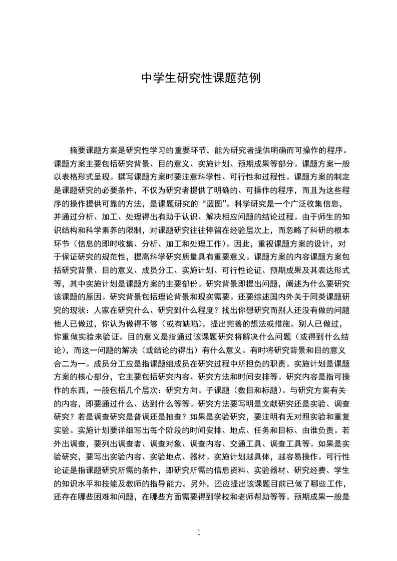 摘要课题方案是研究性学习的重要环节,能为研究者提供明确而可操作的程序。课题方案主要包括研究背景、目的意义、实施计划、预期成果等部分。课题方案一般以表格形式呈现。撰写课题方案时要注意科学性、可行性和过程性。课题方案的制定是课题研究的必要条件,不仅为研究者提供了明确的、可操作的程序,而且为这些程序的操作提供可靠的方法,是课题研究的“蓝图”。科学研究是一个广泛收集信息,并通过分析、加工、处理得出有助于认识、解决相应问题的结论过程。由于师生的知识结构和科学素养的限制,对课题研究往往停留在经验层次上,而忽略了科研的根本环节(信息的即时收集、分析、加工和处理工作)。因此,重视课题方案的设计,对于保证研究的规范性,提高科学研究质量具有重要意义。课题方案的内容课题方案包括研究背景、目的意义、成员分工、实施计划、可行性论证、预期成果及其表达形式等,其中实施计划是课题方案的主要部份。研究背景即提出问题,阐述为什么要研究该课题的原因。研究背景包括理论背景和现实需要。还要综述国内外关于同类课题研究的现状:人家在研究什么、研究到什么程度?找出你想研究而别人还没有做的问题。他人已做过,你认为做得不够(或有缺陷),提出完善的想法或措施。别人已做过,你重做实验来验证。目的意义是指通过该课题研究将解决什么问题(或得到什么结论),而这一问题的解决(或结论的得出)有什么意义。有时将研究背景和目的意义合二为一。成员分工应是指课题组成员在研究过程中所担负的职责。实施计划是课题方案的核心部分,它主要包括研究内容、研究方法和时间安排等。研究内容是指可操作的东西,一般包括几个层次:研究方向。子课题(数目和标题)。与研究方案有关的内容,即要通过什么、达到什么等等。研究方法要写明是文献研究还是实验、调查研究?若是调查研究是普调还是抽查?如果是实验研究,要注明有无对照实验和重复实验。实施计划要详细写出每个阶段的时间安排、地点、任务和目标、由谁负责。若外出调查,要列出调查者、调查对象、调查内容、交通工具、调查工具等。如果是实验研究,要写出实验内容、实验地点、器材。实施计划越具体,越容易操作。可行性论证是指课题研究所需的条件,即研究所需的信息资料、实验器材、研究经费、学生的知识水平和技能及教师的指导能力。另外,还应提出该课题目前已做了哪些工作,还存在哪些困难和问题,在哪些方面需要得到学校和老师帮助等等。预期成果一般是论文或调查(实验)报告等形式。成果表达方式是通过文字、图片、实物和多媒体等形式来表现。课题方案的格式一般用表格形式呈现,也可用其它方式表达(详见附件:研究性学习课题“宠物热对社区生活的影响”的课题方案)。撰写课题方案的注意事项一要注意可行性。课题方案要详细、明了,研究方法和步骤要具备可操作性。实施计划要写得具体、翔实,各研究阶段时间安排要合理、充裕,课内时间一般用于选题、搜集资料、交流展示,而调查、实验、材料处理、论文撰写尽量安排在课外;若是实验研究要考虑重复实验,以排除偶然因素的干扰。研究方法的选择要根据课题内容、学生认知水平及教师的指导能力来确定。资料搜集和实验尽量在校内完成。二要注意科学性。课题方案要体现出立意新颖、结构严谨、行文流畅等特点。提出问题和目的意义要与预期结果相吻合;方案中各部分切忌张冠李X;获得的信息资料和提出的观点要客观真实,经得起推敲。三要注意过程性。整个研究过程必须在课题方案中体现出来,如研究内容、研究方法、研究步骤(选题开题资料搜集实施结题交流展示研究后反思)和预期结果等等。