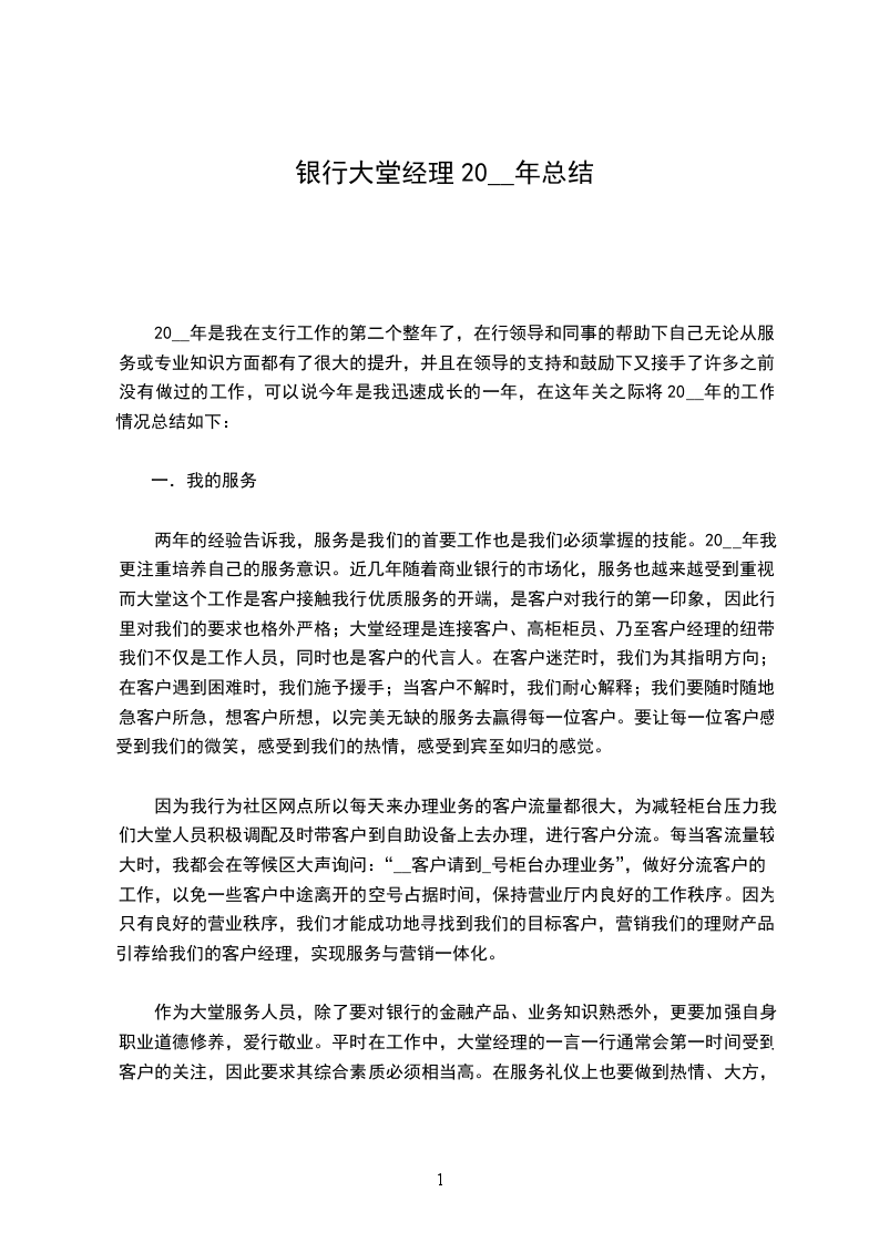 三、下一步工作准备在过去的20_年中,我在大堂经理这个岗位上学习到了很多与客户沟通的阅历和一些营销的技巧,但也存在一些缺乏之处。在今后的工作中,我会连续做好文明优质效劳,通过全体柜员的努力,稳固资金组织成果,稳定存量,连续做好各项日常工作,做好业务保障,进步柜员整体素养,促进经营安康进展,推动XX存储业务上一个新台阶。
