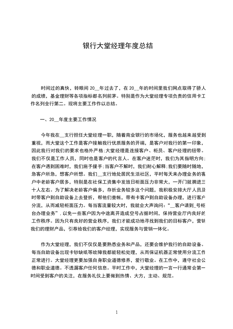 时间如白驹过隙,转瞬间一年过去了,在这一年的时间里我们XX获得了骄人的成果,基金理财等各项指标都名列前茅。作为大堂经理我可以很好的效劳客户,乐观完成指导布置的各项任务。现将主要工作进展总结。