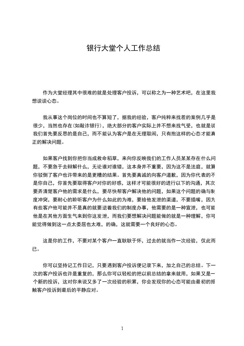 一、主要工作状况我去年9月担当_支行大堂经理一职,随着农业银行的市场化,效劳也越来越受到重视,而大堂经理这个工作是客户接触优质效劳的开端,是客户对XX的第一印象,因此XX对大堂经理的要求也非常严格,大堂经理是连接客户、柜员、客户经理的纽带。大堂经理不仅是XX的一名工作人员,同时也是客户的代言人。一是做好文明优质效劳。我们_支行地处居民生活社区,平常每天来办理业务的客户中老龄客户居多,特殊是在社保工资集中发放日,柜面压力特别大,通常都是从早忙到晚,急客户所急,想客户所想。为理解决老龄客户偏多,存折业务较多这个问题,我乐观支配大厅人员准时带客户到自助设备上去登折,帮他们查帐,带有卡客户到自助设备办理,进展客户分流,从而减轻柜面压力。每当客流量较大时,我就会大声询问:“_客户请到_号柜台办理业务,以免一些客户因为中途分开造成空号占据时间,保持营业厅内良好的工作秩序。因为只有良好的营业秩序,我们才能成功地查找到我们的目的客户,营销我们的理财产品,推荐给我们的客户经理,实现效劳与营销一体化。二是加强自身职业道德修养。作为大堂经理,我不仅仅是要熟识业务和产品,还要会维护我行的自助设备。每当自助设备消失卡钞缺纸等故障我都能轻松处理,从而保证机器正常使用分流工作正常进展。大堂经理更要加强自身职业道德修养,爱行敬业。在工作中,遵守社会公德和职业道德,不透漏客户任何信息。平常工作中,我在效劳礼仪上做到了热忱、大方,主动、标准四是充分进步协调力量。大堂经理熬炼了我的的协调力量,充分调动好四方人员和保安师傅的工作,发挥他们的作用并协调柜员和大厅工作人员,常常开展柜面学习,进步网店的分散力,发挥团队精神。担当大堂经理以来,我对自己高标准严要求,仔细效劳客户,乐观完成指导布置的各项任务。
