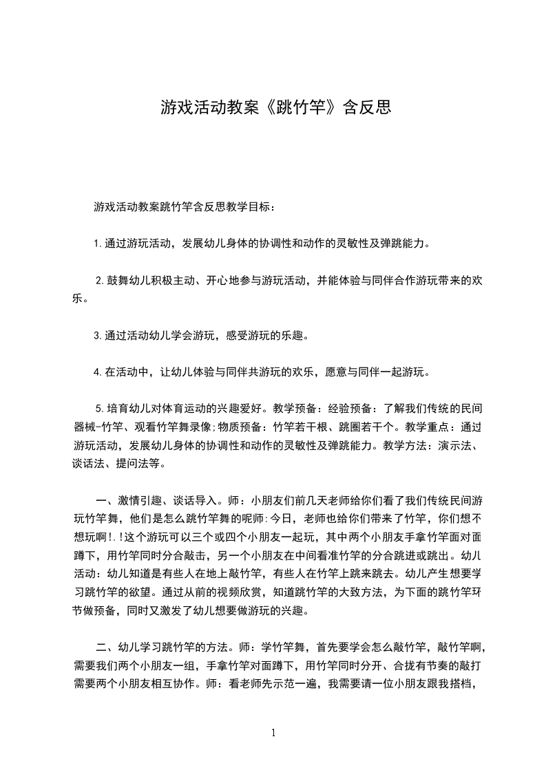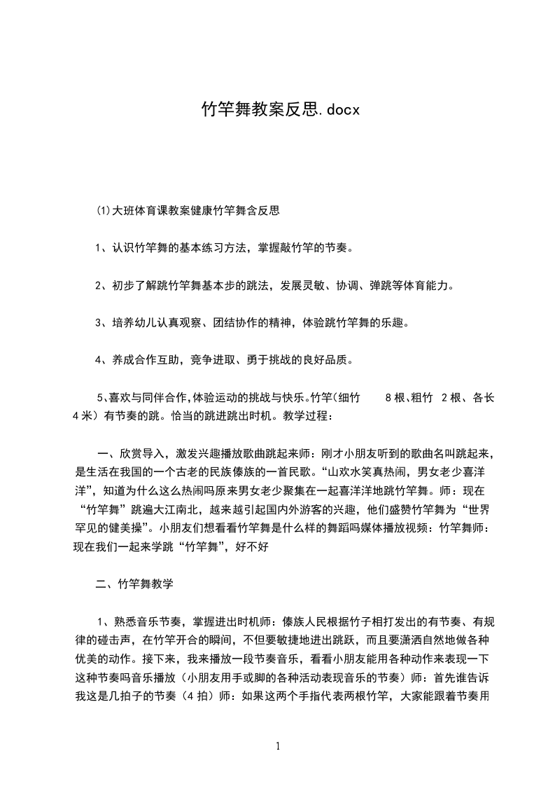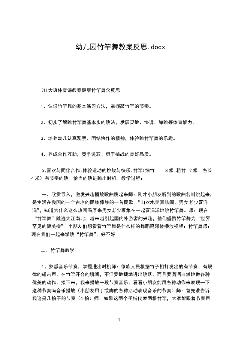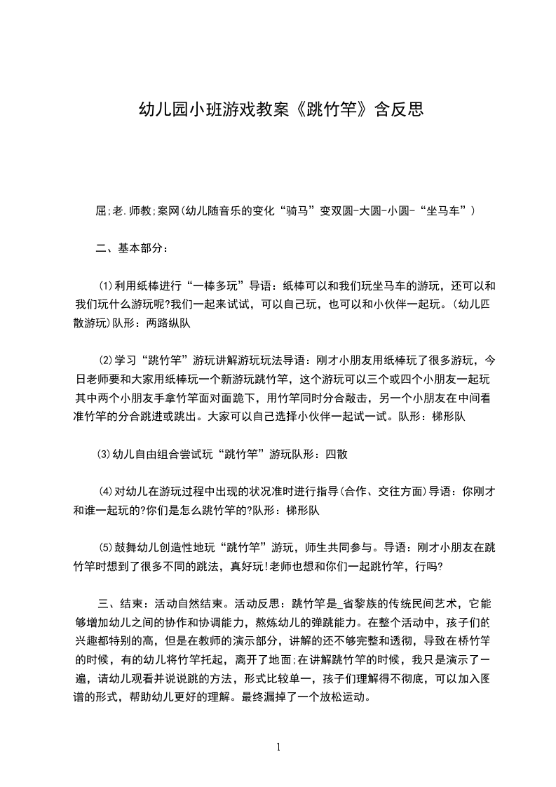 五、 活动结束做放松运动。刚才小朋友表现的都非常好,今天是小猪娶亲的日子,我就用竹竿做了一顶花轿,我们一起送小猪和他的新娘子回家吧!(一幼儿扮演新娘子,一组幼儿拿红绸跳舞,一组幼儿骑马、一组幼儿用竹竿伴奏),带出活动室。活动反思:本次活动主要是通过纸棒学习跳竹竿游戏,发展幼儿弹跳能力。在心育方面提出的两点目标-想办法解决活动中遇到的困难;体验与同伴合作游戏带来的成功和快乐。整个活动充分发挥纸棒的多功能性,活动开始部分设计了随音乐利用纸棒进行队列练习在这一环节中由两队骑马变双圆-变小圆-合作组合坐马车体现了动静交替的原则,让幼儿初步尝试了与同伴合作的快乐,同时也为下一个环节奠定了基础。基本部分中,先让幼儿利用纸棒进行一物多玩,鼓励幼儿与同伴合作,并积极推广三-四人结伴游戏。接着运用尝试法学习的理论精神,教师不示范游戏玩法及规则,而是引导幼儿去自主探索(敲击竹竿的两人如何合作?中间跳的人如何跳?如果跳的过程中发现了一些情况怎么办?等),从而通过尝试、发现-再尝试、再发现,形成师生互动、生生互动的不断调整的过程,通过师生共同表演跳竹竿,将活动掀起高潮,突出了师生双主体的地位,结束活动中通过叫号接棒的游戏帮助幼儿调整教大的活动量。在活动中,教师与幼儿共同学习,实现了师生共同体的学习氛围,在整个活动过程中,将幼儿心育目标的培养放在了一定的高度。如:始终鼓励幼儿与同伴合作,有了困难引导幼儿去主动解决等等。但这仅靠这一活动是远远不够的,还需要在日常的教育教学活动中坚持渗透,使幼儿的心理品质得以良好、健康地发展。大班体育教案好玩的竹竿含反思这篇文章共4305字。