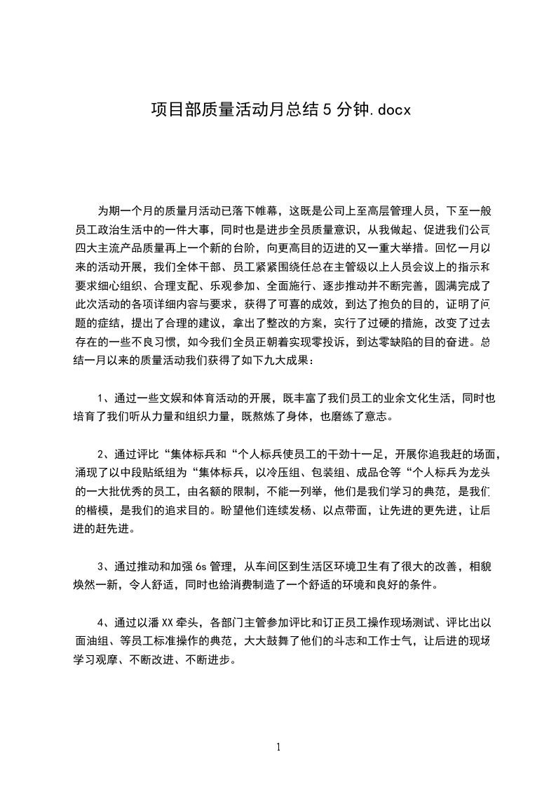 8、通过此次活动开展,大大消弱外协供应商傲睨质量的意气,每日由品质部对客户进展产品质量调查,解决产品中存在的问题,同时派员驻厂跟踪指导,安装测试、监视掌握,施行先全检、后包装、再抽检、然后入库的方法步骤进展工作,根据制定检查标准,将问题觉察在前面,解决了在流入客户手中之先,削减了投诉,增加公司的信誉。以上成果的获得,离不开任总的正确指导,离不开以消费部陆XX为首的及全体员工的大力支持、乐观协作、共同努力而来,更离不开我们品质部全体人员的上下协作、培训指导,虽然“质量月已近尾声,但我们要根据任总的指示:此次活动不是流入形式,要深化、落到实处,不要将其作为一场运动,而是要长期坚持下去,把它作为一个企业管理来制定,把产生不良品的隐患掌握在可能消失的萌芽状态,力争日事日清,日清日高。总之,此次活动的成功,公司全员都倾注了大量的心血,付出了辛勤的汗水,通过一系列举措,有效的提升了全员的品质意识,大家都齐心协力了!工友们:为的明天更加辉煌绚烂,努力吧!工程部质量活动月总结