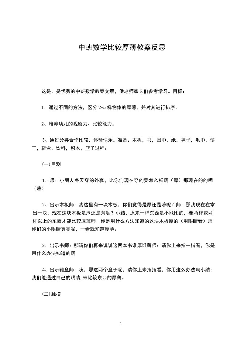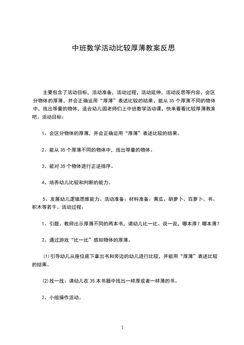 四、 寻找,操作师:我们的家里,教室里都有很多的东西可以用来比厚薄,那现在我们就到教室里去比一下。活动反思:活动开始后,为了增加活动的趣味性,我采用了情景导入的方法;小兔去买衣服,请小朋友们帮小兔选一件薄厚合适的衣服。果然,表演一开始就牢牢的吸引住了孩子们的注意力。孩子们开始积极地给小兔帮忙,甚至在活动结束后一位小朋友还意犹未尽的和我说:“老师,我觉得你今天的表演太有意思了。”但是也有美中不足,我比较了三件衣服的薄厚,缺少严谨的数学语言去归纳,如哪件最薄、哪件最厚,哪件介于两者之间。同时,由于三件衣服比较之后已经是按顺序排好了的,所以再让小朋友们来排序就没有意义了,所以就没有让孩子们正逆排序,这里就忽视了目标2,其实可以问问孩子们:“衣服是按什么顺序排好的,还可以怎么排?”这样就会引出正逆排序。看样子在设计活动的时候考虑的还不够周全,在处理课堂随机应变的方面还需要再加强锻炼。接下来我请孩子们找一找生活中还有哪些东西可以比较薄厚,因为缺乏生活经验,我也没有提供大需范例,所以一下子就把孩子们考住了,看样子平时生活中的教育还需多关注,老师要做一个有心人,扩充孩子们的知识面。最后在分组操作的比较中,我将孩子们分成四个组,第一组比较书的薄厚,第二组比较衣服的薄厚,第三组比较板子的薄厚,第四组比较纸的薄厚。因为前面忽视了正逆排序,所以这里我直接让孩子们按照物体薄厚排排队,却没有先让孩子们比一比薄厚,直接过快的过度导致能力强的孩子独揽大局,能力弱一些或内向一点的孩子无所事事。其实如果让孩子们自由选择一件物品之后再和同伴们比一比,再来排排队,就会让孩子们动起来,再让孩子们交换组试一试,活动将会更加有趣。中班数学活动:感知图形的特征:中班数学活动感知图形的特征教案主要包含了活动目标,活动准备,活动过程,活动反思等内容,进一步认识圆形、三角形、正方形,感知形状的主要特征。认识圆形、正方形、三角形图形标记,并学习按照图形标记制作相应的形状。适合幼儿园老师们上中班数学活动课,快来看看幼儿园中班数学活动感知图形的特征教案吧。中班数学教案:5以内的相邻数:中班数学活动5以内的相邻数教案主要包含了活动目标,活动准备,活动过程等内容,知道相邻数的概念,掌握5以内各数的相邻数。理解并能说出相1或少1的关系。适合幼儿园老师们上中班数学活动课,快来看看中班数学5以内的相邻数教案吧。中班数学教案:6以内的物体按数量归类:中班数学活动6以内的物体按数量归类教案主要包含了活动目标,活动准备,活动过程等内容,尝试将6以内的物体按数量归类,并用数字表示物体的数量。继续学习正确目测6以内的数群。适合幼儿园老师们上中班数学活动课,快来看看中班数学6以内的物体按数量归类教案吧。