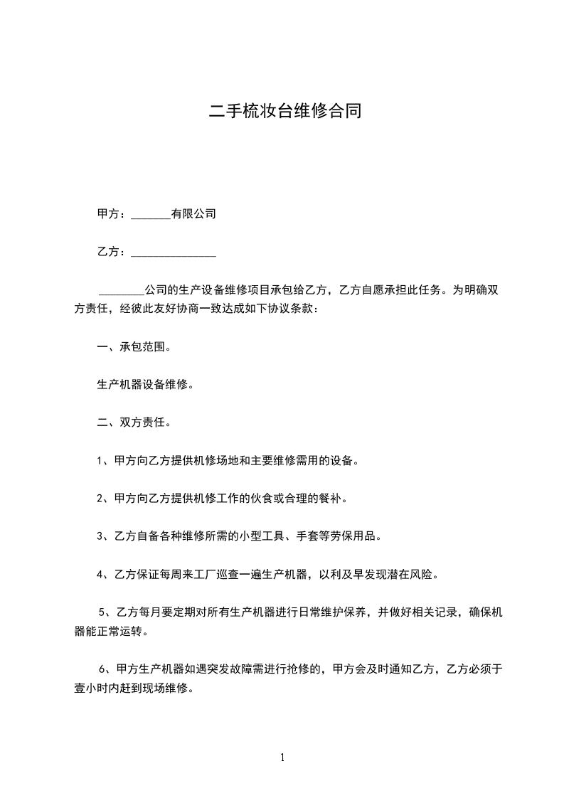 1、甲方向乙方提供机修场地和主要维修需用的设备。