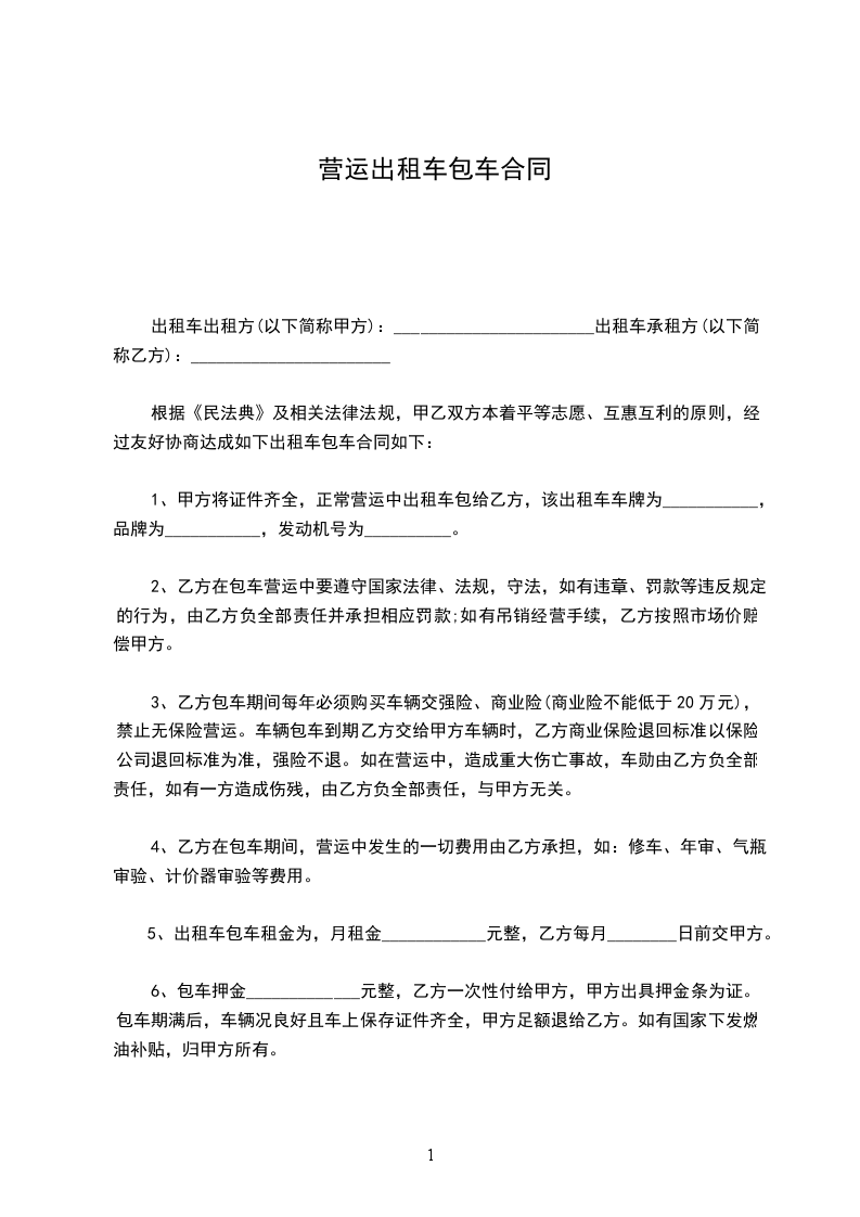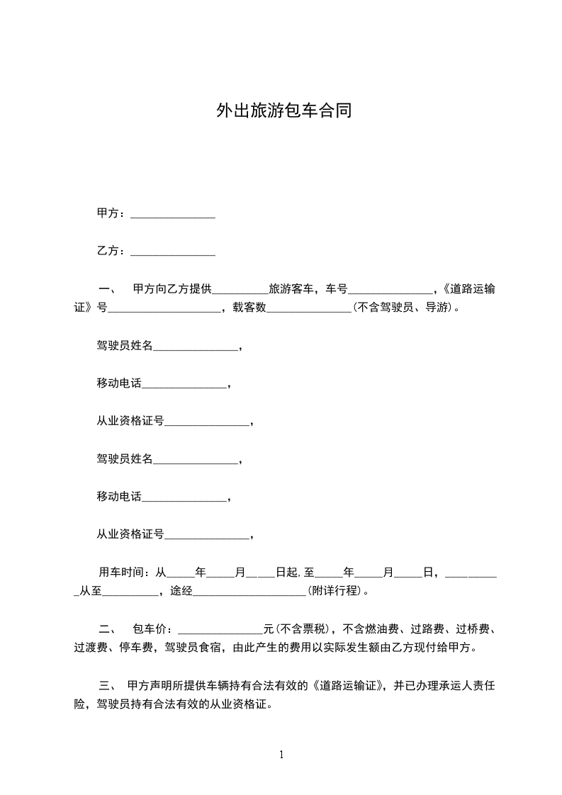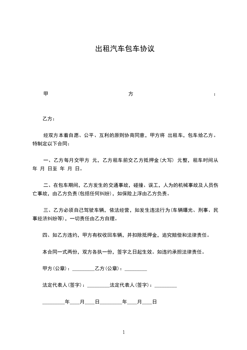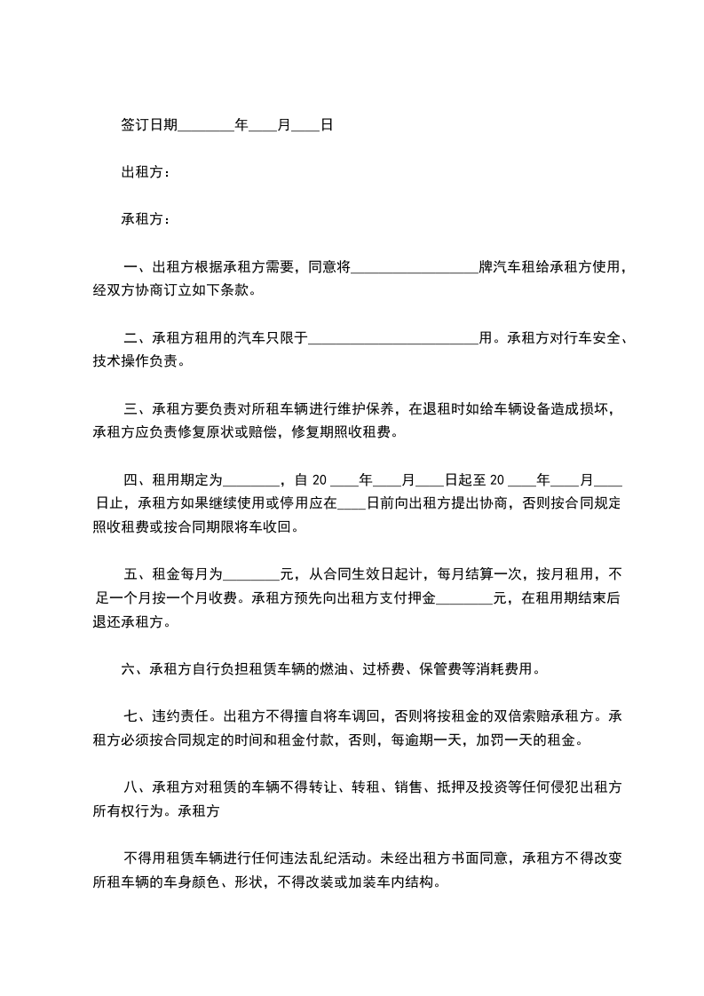 一、出租方根据承租方需要,同意将_________牌汽车租给承租方使用,经双方协商订立如下条款。