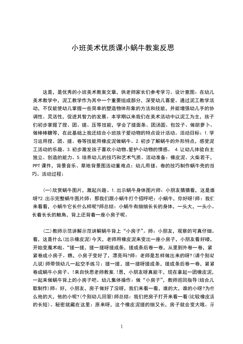 这是,是优秀的小班美术教案文章,供老师家长们参考学习。设计意图:在幼儿美术教学中,泥工教学作为其中一个重要组成部分,深受幼儿喜爱。通过泥工教学活动,不仅能使幼儿掌握一些简单的塑造物体形象的方法和技能,并能增强幼儿手的协调性、灵活性,促进其智力的发展。本学期以来我们在美术活动中以泥工为主,孩子们初步掌握了捏、团、搓、压等技能,学会了搓面条、团汤圆、包饺子、做胡萝卜、做棒棒糖等,在此基础上我还结合小班孩子爱动物的特点设计活动。活动目标:1.学习运用捏、团、搓、卷等技能用橡皮泥做蜗牛。2.初步了解蜗牛的外形特点,感受泥工活动的乐趣。3.初步激发孩子喜欢小动物、爱护小动物的情感。4.让幼儿体验自主、独立、创造的能力。5.培养幼儿的技巧和艺术气质。活动准备:橡皮泥、火柴若干,PPT课件,背景音乐、草地背景图活动重难点:幼儿用搓、卷的技巧制作蜗牛壳的技巧。活动过程: