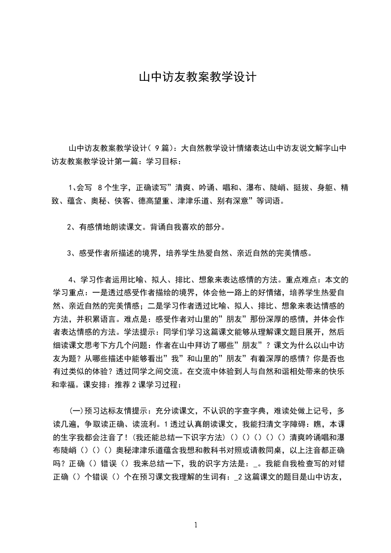 山中访友教案教学设计(9篇):大自然教学设计情绪表达山中访友说文解字山中访友教案教学设计第一篇:学习目标: