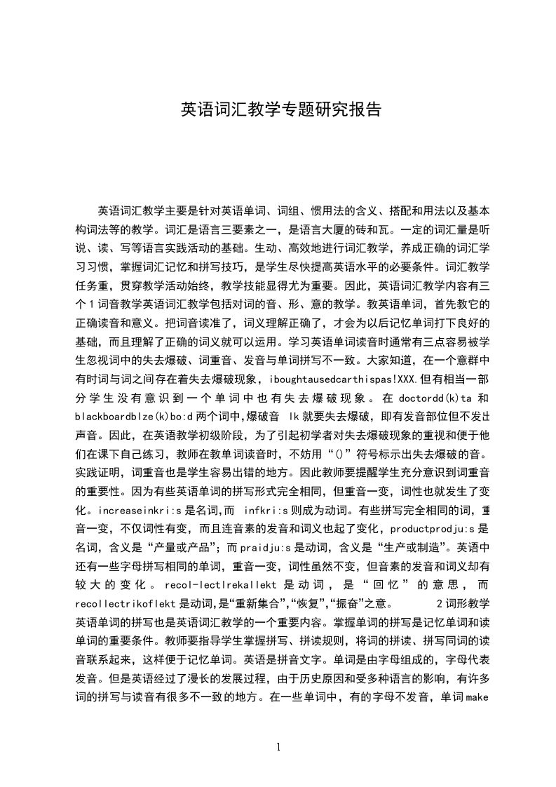 英语词汇教学主要是针对英语单词、词组、惯用法的含义、搭配和用法以及基本构词法等的教学。词汇是语言三要素之一,是语言大厦的砖和瓦。一定的词汇量是听、说、读、写等语言实践活动的基础。生动、高效地进行词汇教学,养成正确的词汇学习习惯,掌握词汇记忆和拼写技巧,是学生尽快提高英语水平的必要条件。词汇教学任务重,贯穿教学活动始终,教学技能显得尤为重要。因此,英语词汇教学内容有三个1词音教学英语词汇教学包括对词的音、形、意的教学。教英语单词,首先教它的正确读音和意义。把词音读准了,词义理解正确了,才会为以后记忆单词打下良好的基础,而且理解了正确的词义就可以运用。学习英语单词读音时通常有三点容易被学生忽视词中的失去爆破、词重音、发音与单词拼写不一致。大家知道,在一个意群中有时词与词之间存在着失去爆破现象,iboughtausedcarthispas!XXX.但有相当一部分学生没有意识到一个单词中也有失去爆破现象。在doctordd(k)ta和blackboardblze(k)bo:d两个词中,爆破音lk就要失去爆破,即有发音部位但不发出声音。因此,在英语教学初级阶段,为了引起初学者对失去爆破现象的重视和便于他们在课下自己练习,教师在教单词读音时,不妨用“()”符号标示出失去爆破的音。实践证明,词重音也是学生容易出错的地方。因此教师要提醒学生充分意识到词重音的重要性。因为有些英语单词的拼写形式完全相同,但重音一变,词性也就发生了变化。increaseinkri:s是名词,而infkri:s则成为动词。有些拼写完全相同的词,重音一变,不仅词性有变,而且连音素的发音和词义也起了变化,productprodju:s是名词,含义是“产量或产品”;而praidju:s是动词,含义是“生产或制造”。英语中还有一些字母拼写相同的单词,重音一变,词性虽然不变,但音素的发音和词义却有较大的变化。recol-lectlrekallekt是动词,是“回忆”的意思,而recollectrikoflekt是动词,是“重新集合”,“恢复”,“振奋”之意。2词形教学英语单词的拼写也是英语词汇教学的一个重要内容。掌握单词的拼写是记忆单词和读单词的重要条件。教师要指导学生掌握拼写、拼读规则,将词的拼读、拼写同词的读音联系起来,这样便于记忆单词。英语是拼音文字。单词是由字母组成的,字母代表发音。但是英语经过了漫长的发展过程,由于历史原因和受多种语言的影响,有许多词的拼写与读音有很多不一致的地方。在一些单词中,有的字母不发音,单词make和late中e不发音。然而,有时一个字母却代表几种不同的发音,如元音字母o就有几种不同的读音,homehaum,hothot,whosehuz,bottomibdtam。有时两个发音又代表多种不同的字母或字母组合,元音3u可代表note中o的发音,boat中oa的发音,glow中ow的发音等。这种音形不一致的情况是学生学习和记忆单词的难点,也是教师进行词汇教学的重点。这并不是说英语单词的拼写与读音是没有规律的,相反,大部分的英语单词的拼写和读音是有规律可循的。人们在长期使用和学习英语语言的过程中,总结出了一些读音规则。教师在英语词汇教学中,要注意引导学生将单词与读音规则结合起来学习,运用拼读规则,按照音节读单词,以提高学生记单词的速度。3词义教学对学生来说,词汇学习指的是学习单词代表什么意义。词汇教学和学习的目的是把词汇变成有意义的刺激,使之与一定的概念联系起来。章兼中说,任何语言的单词都是代表主观世界和客观世界的概念。这种代表关系是约定俗成的。然而,各种语言中的词汇所代表的概念不完全相同,比如汉语和英语单词所代表的概念之间的关系有以下两种有些英语单词和彝语词所代表的概念完全相同。有些英语单词,一个词可以代表彝语中的几个不同的概念,如英语的grandfather代表汉语的“祖父,外祖父,老大爷”;英语的uncle代表汉语的“叔父,伯父,舅父,姑父,姨父”等。可见,英汉两种语言中除了部分单词所代表的概念完全相同外,其余单词则代表着不完全相同的概念体系。因此,章兼中说,教词汇的意义就是要指出两种语言词汇所代表的共同概念体系和不同的概念体系的区别;掌握两种语言词汇的个性与共性,使学生逐渐形成既要与母语不同的概念体系,又要在其基础上形成相对应的交叉联想体系。