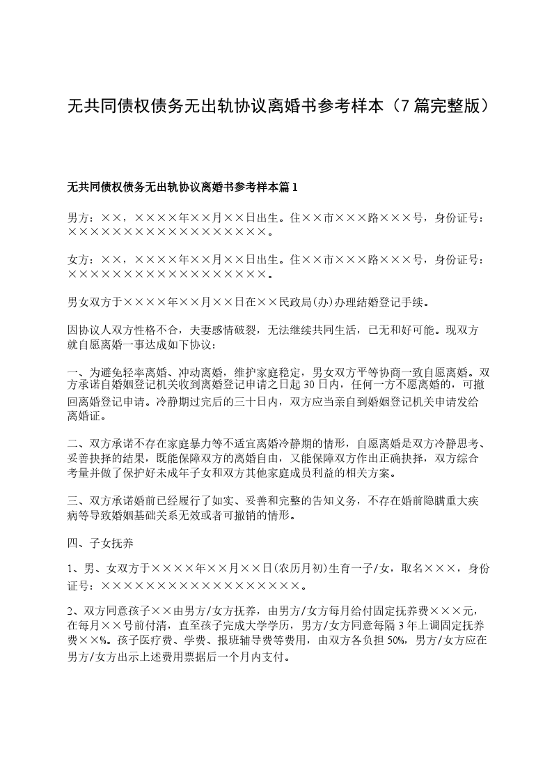 无共同的债权无出轨离婚协议参考样式篇7