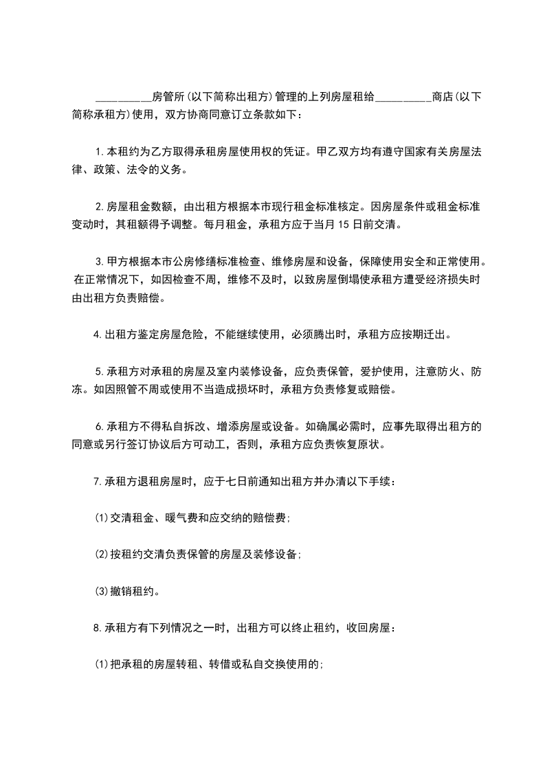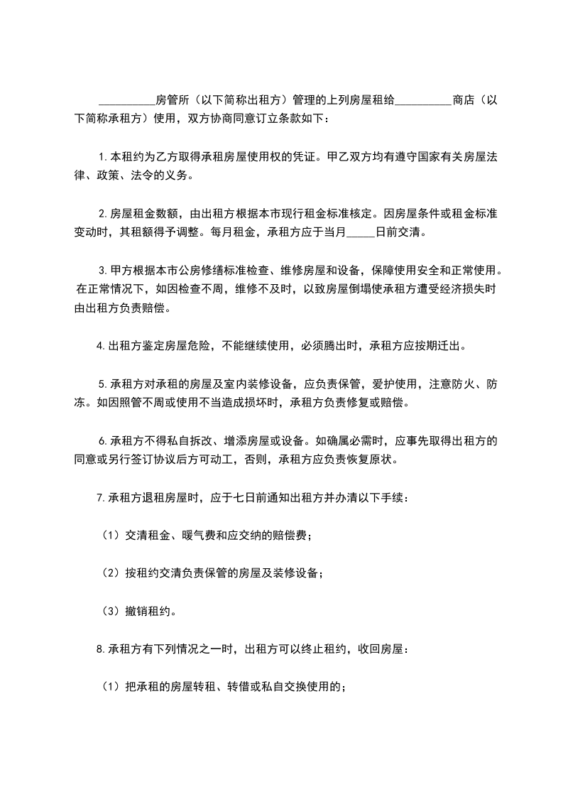 __________房管所(以下简称出租方)管理的上列房屋租给__________商店(以下简称承租方)使用,双方协商同意订立条款如下: