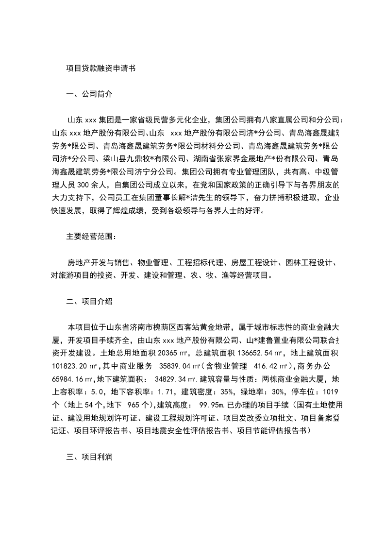 本项目位于山东省济南市槐荫区西客站黄金地带,属于城市标志性的商业金融大厦,开发项目手续齐全,由山东xxx地产股份有限公司、山*建鲁置业有限公司联合投资开发建设。土地总用地面积20365㎡,总建筑面积136652.54㎡,地上建筑面积101823.20㎡,其中商业服务35839.04㎡(含物业管理416.42㎡),商务办公65984.16㎡,地下建筑面积:34829.34㎡.建筑容量与性质:两栋商业金融大厦,地上容积率:5.0,地下容积率:1.71,建筑密度:35%,绿地率:30%,停车位:1019个(地上54个,地下965个),建筑高度:99.95m.已办理的项目手续(国有土地使用证、建设用地规划许可证、建设工程规划许可证、项目发改委立项批文、项目备案登记证、项目环评报告书、项目地震安全性评估报告书、项目节能评估报告书)