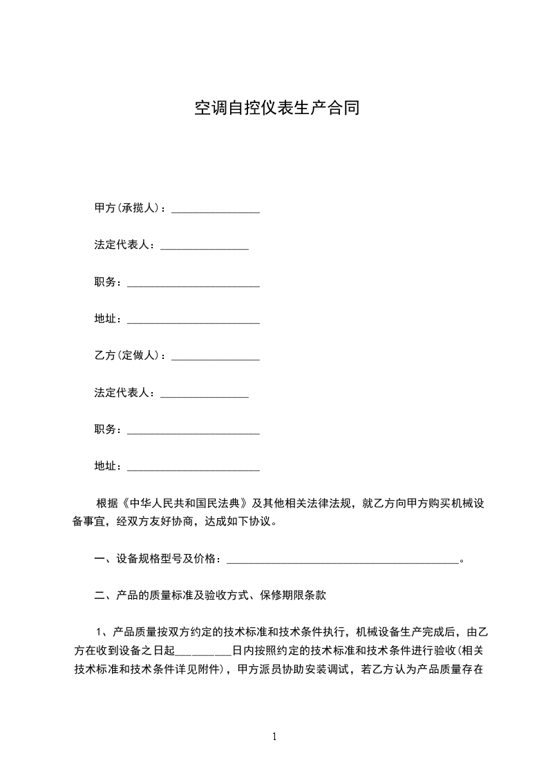 1、产品质量按双方约定的技术标准和技术条件执行,机械设备生产完成后,由乙方在收到设备之日起__________日内按照约定的技术标准和技术条件进行验收(相关技术标准和技术条件详见附件),甲方派员协助安装调试,若乙方认为产品质量存在问题,必须在货物验收之日起__________日内以书面的形式提出,如超过此期限未提出异议,则视为甲方提供的产品完全符合乙方质量要求。