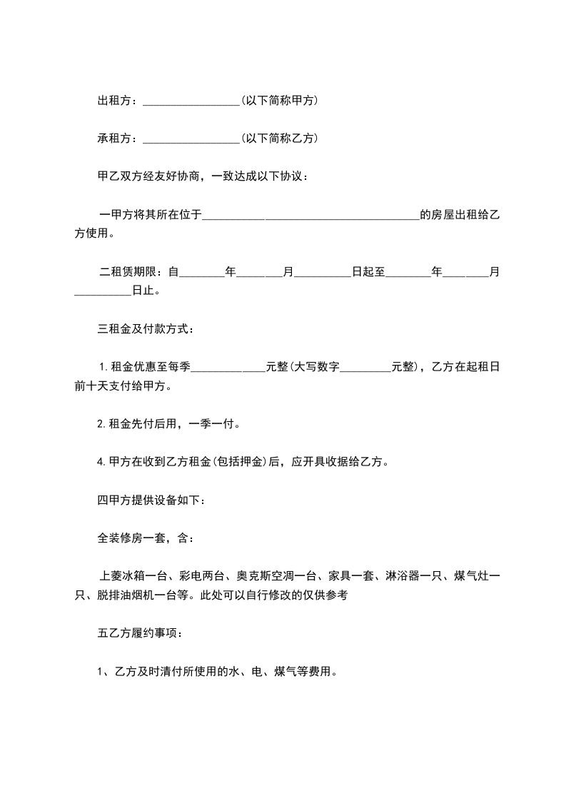 1.租金优惠至每季_____________元整(大写数字/元整),乙方在起租日前十天支付给甲方。