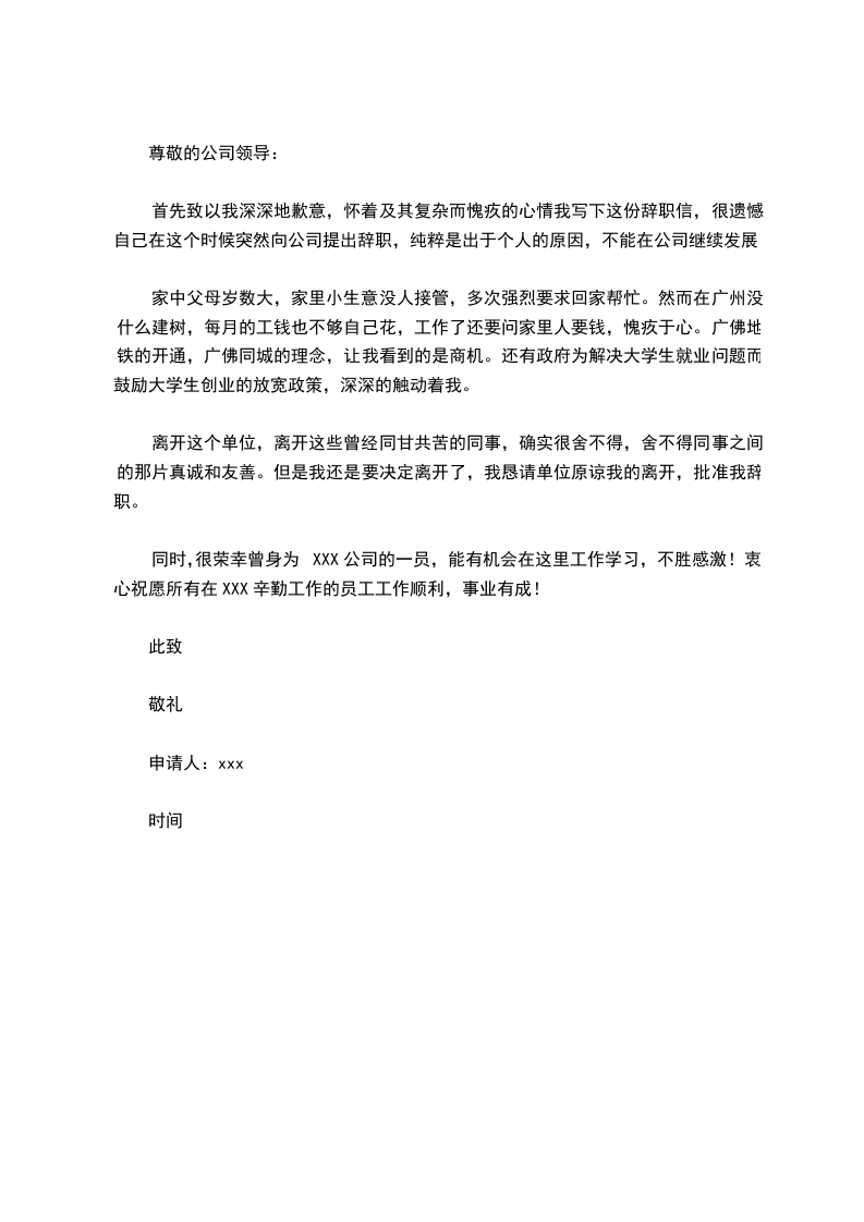 首先致以我深深地歉意,怀着及其复杂而愧疚的心情我写下这份辞职信,很遗憾自己在这个时候突然向公司提出辞职,纯粹是出于个人的原因,不能在公司继续发展!