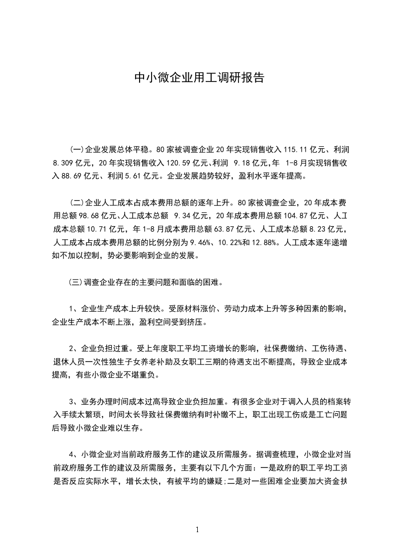二、 当前中小微企业用工成本增加的主要原因当前中小微企业用工成本增加的原因有以下几个方面:一是招不到工。人才招不来、用不上、留不住,部分企业高级技工人才短缺。特别是部分劳动密集型企业,受工资待遇低、劳动时间长、强度大影响,招工难问题较为突出。二是职工队伍稳定难。企业对员工进行培训后,熟练工、技术工以及特殊岗位(如:大客车司机)对工资预期提高,跳槽现象时有发生。三是用工成本上升。企业工人工资大幅上涨;随着企业职工五险一金缴纳不断规范和基数不断上调,企业缴费负担加重。企业员工离职时不与企业办理离职手续,离职后,企业依然要缴纳保险。四是劳动合同法及带薪休假条例的颁布、职业病认定前的前期费用、工伤赔偿费用等致企业用工成本的增加。