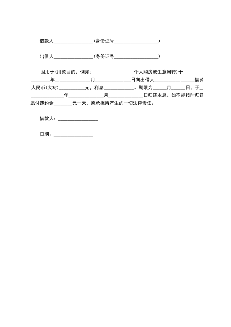 因用于(用款目的,例如:_________________个人购房或生意周转)于_________________年_______________月_______________日向出借人_________________借款人民币(大写)___________元,利息_____________。期限为______月______日,于________________年_______________月_______________日归还本息。如不能按时归还愿付违约金________元一天,愿承担所产生的一切法律责任。